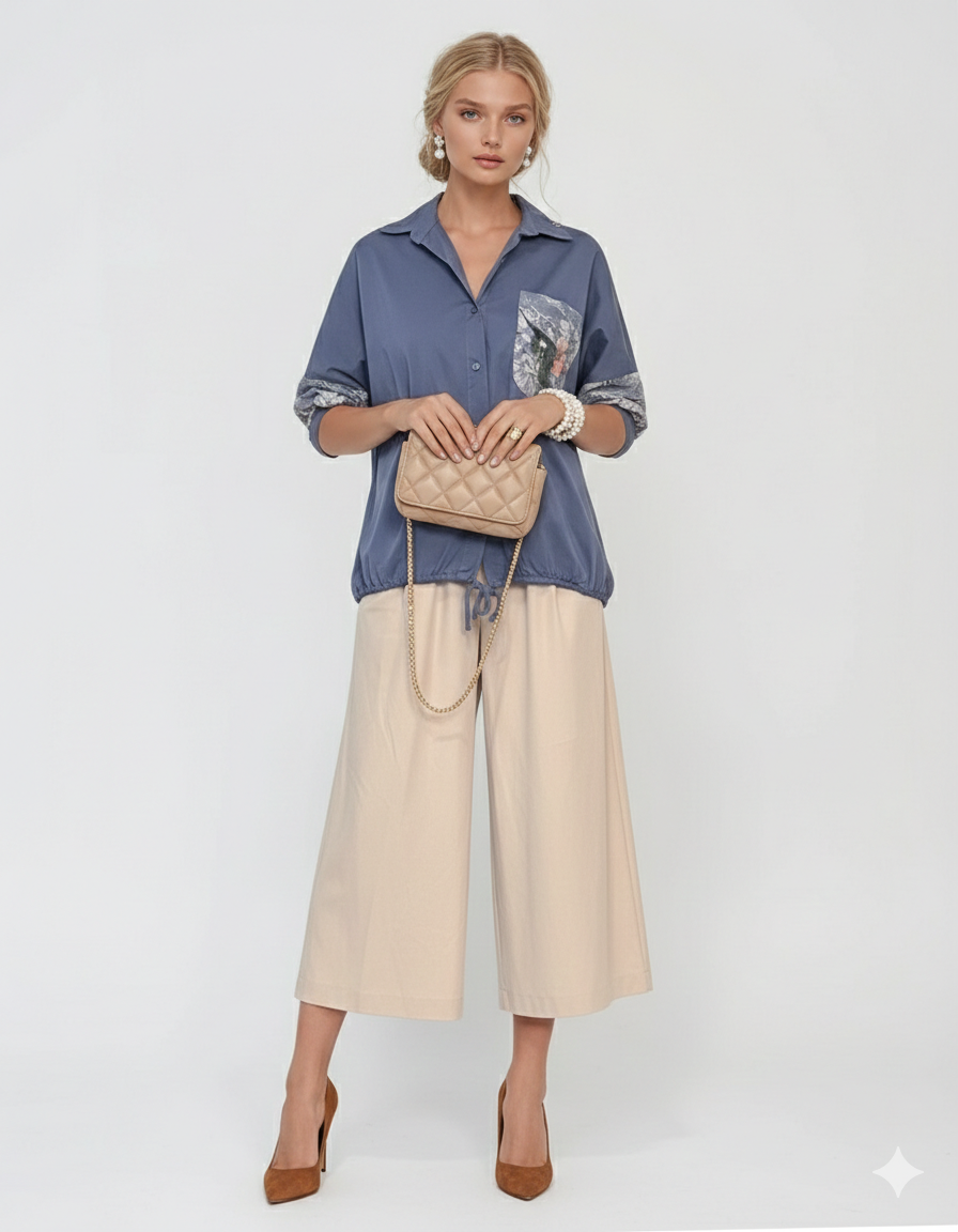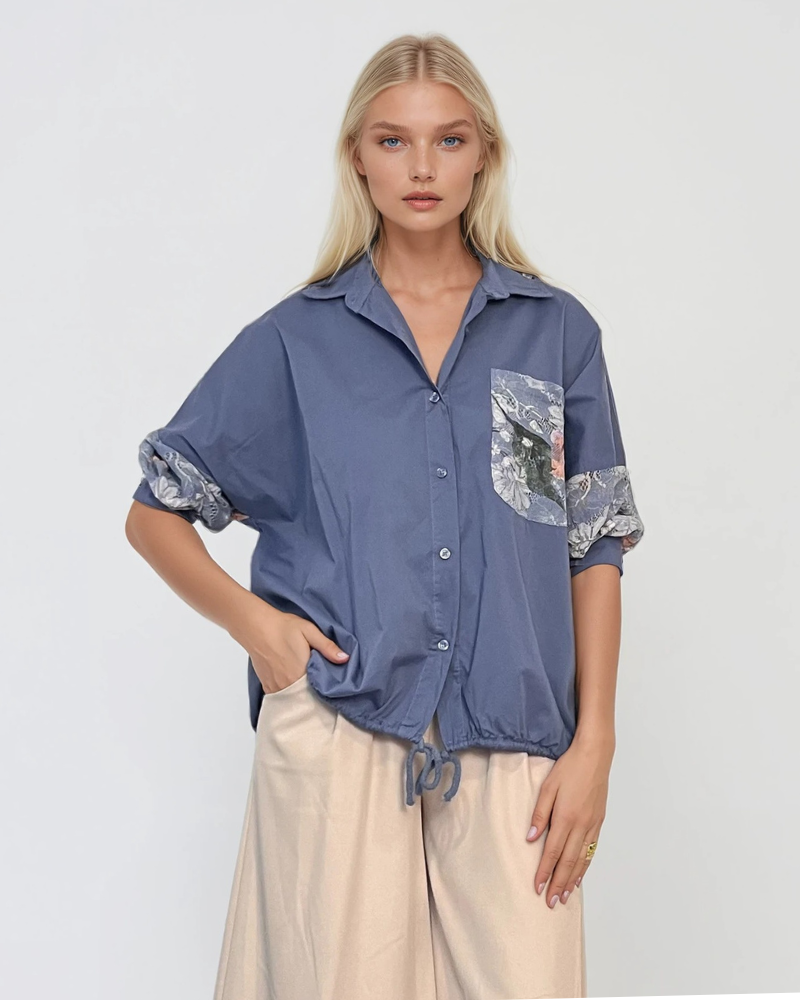 Bluză din bumbac cu dantelă florală la mâneci albastru jeans îmbină stilul modern cu confortul zilnic. Croiala largă și mâneca 3/4 oferă lejeritate, iar șnurul din talie permite ajustarea delicată.