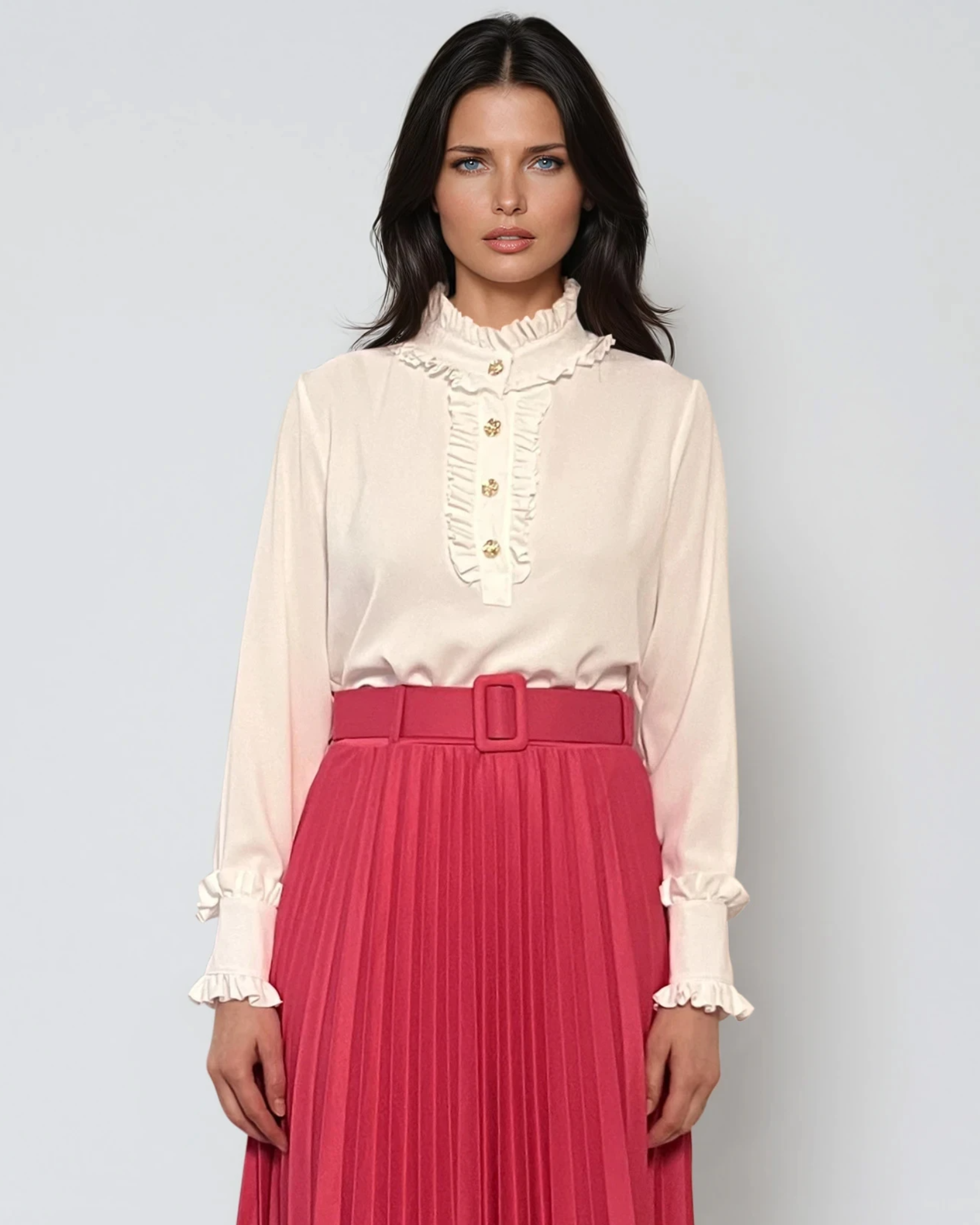 Bluză din voal cu volane la guler și mâneci alb cucerește prin delicatețea designului și aspectul său luminos. Materialul vaporos oferă lejeritate, iar volanele elegante pun în valoare zona gulerului și a mânecilor.