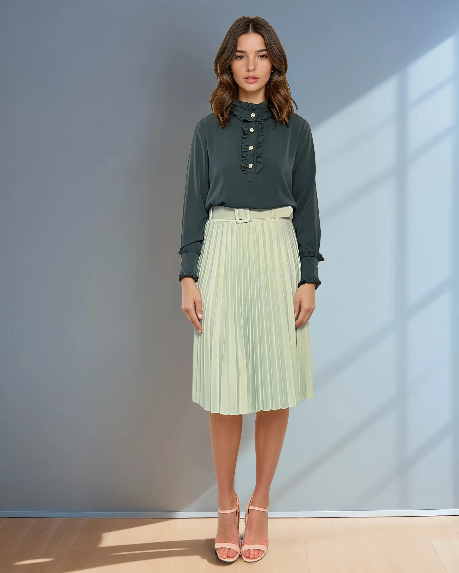 Bluză din voal cu volane la guler și mâneci verde atrage prin nuanța fresh și designul delicat. Volanele subtile de la guler și la capetele mânecilor adaugă un aer jucăuș și feminin, evidențiind stilul elegant și contemporan.