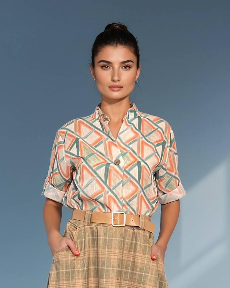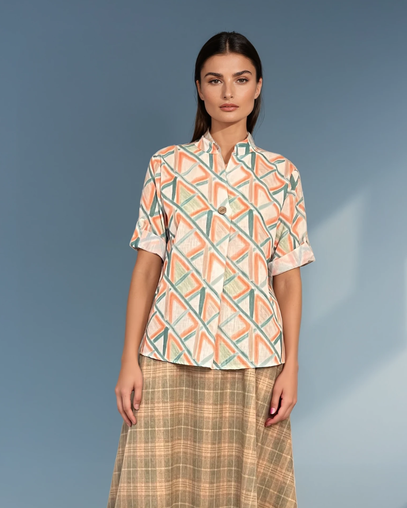 Bluză guler tunică cu un nasture portocaliu adaugă un strop de culoare și prospețime ținutelor tale. Croiala lejeră și nasturele de la guler conferă un aspect modern și elegant în același timp.