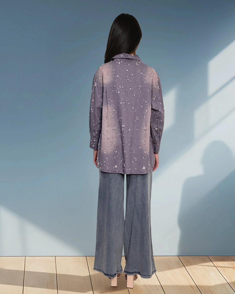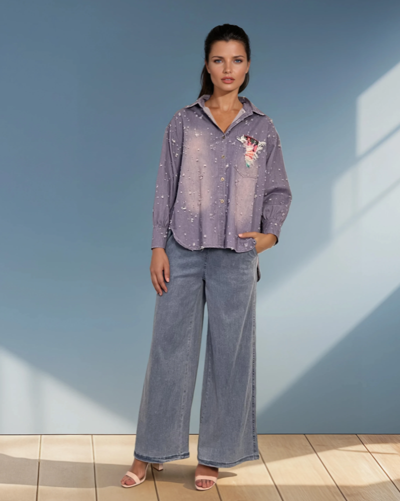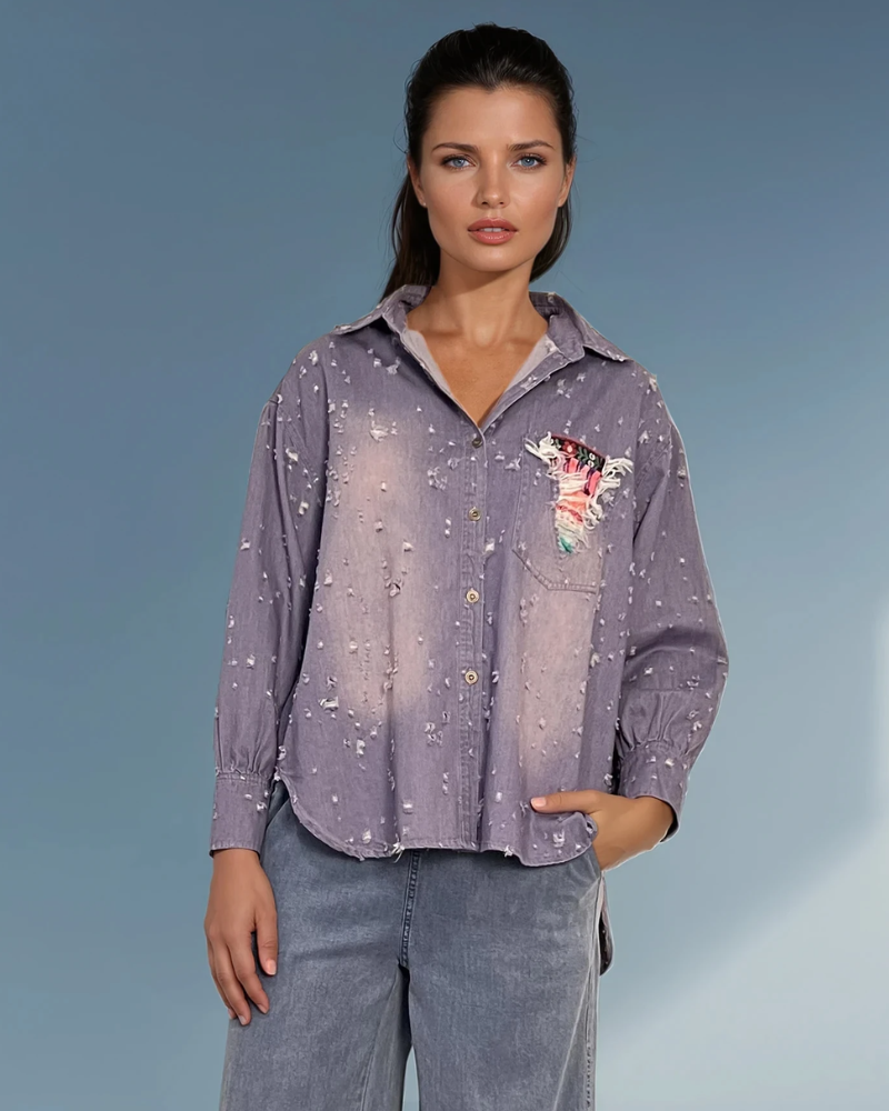 Cămașă damă casual tip jeans cu buzunar contrastant mov se remarcă prin designul modern și combinația de culori atractivă. Buzunarul evidențiat aduce un detaliu fresh și original piesei.