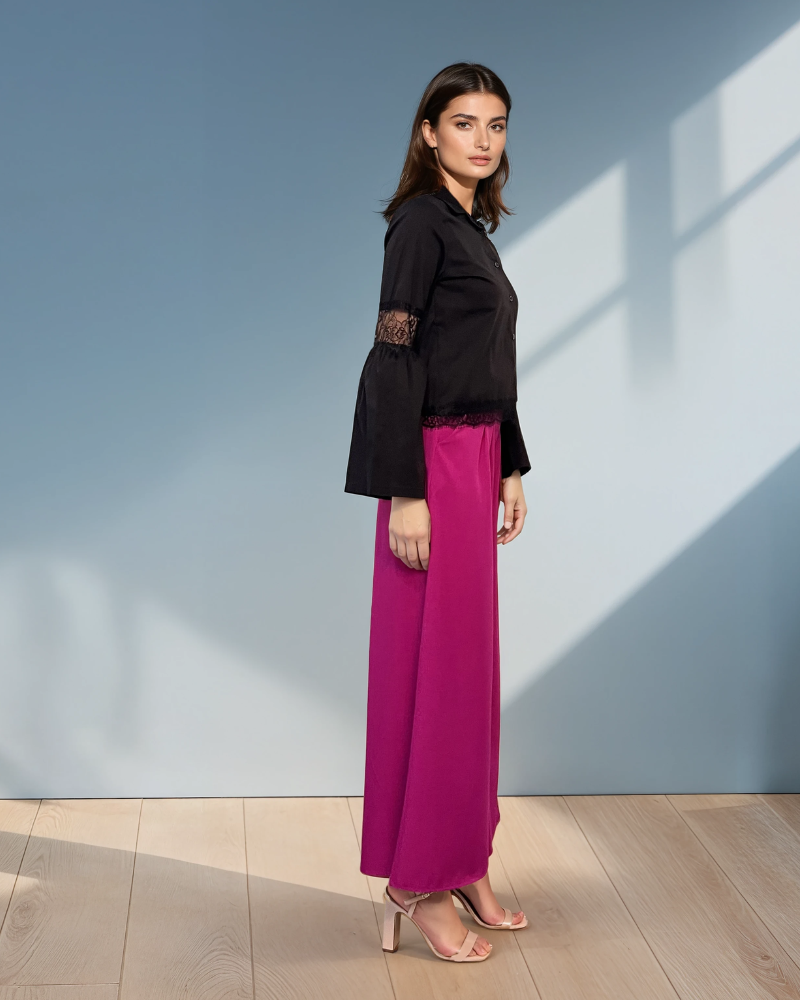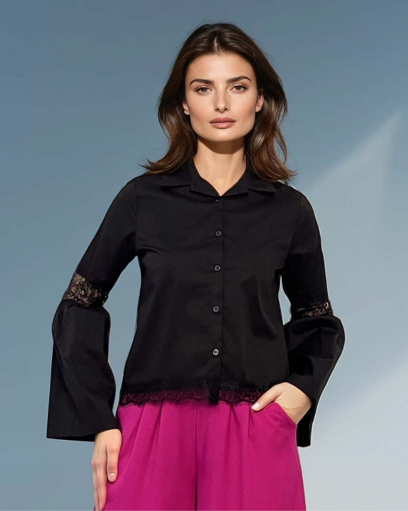 Cămașă din bumbac cu dantelă la tiv și mâneci neagră aduce un plus de rafinament oricărei apariții. Designul este evidențiat de inserțiile din dantelă aplicate la tiv și la nivelul cotului, pentru un efect elegant și modern.