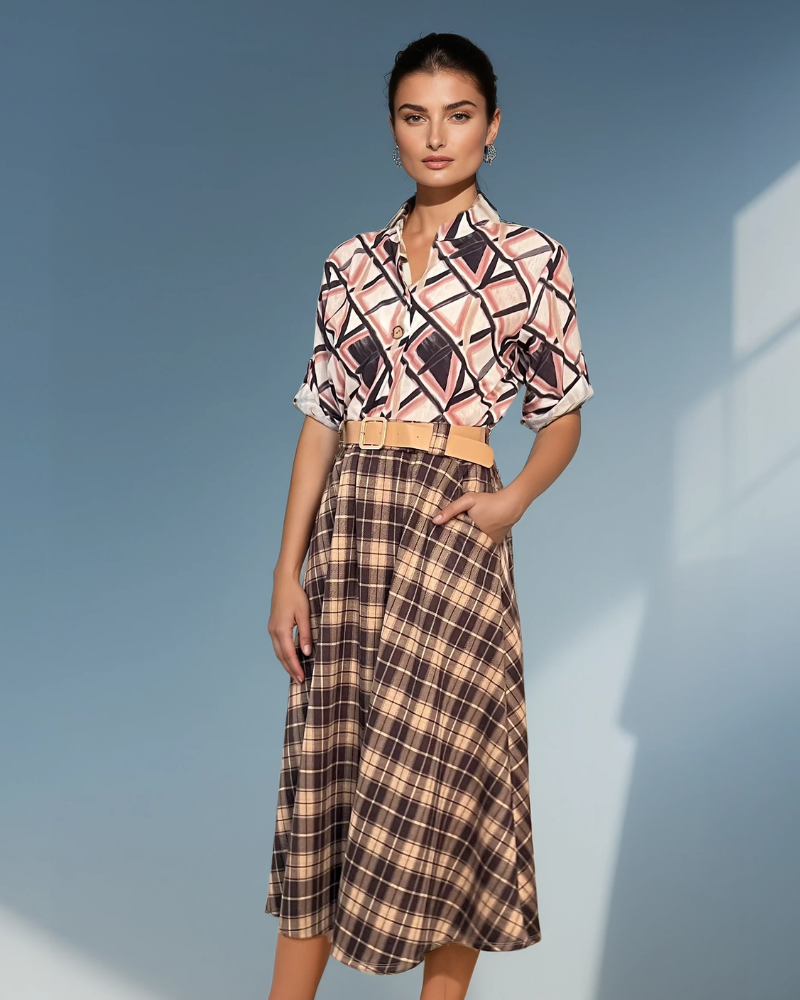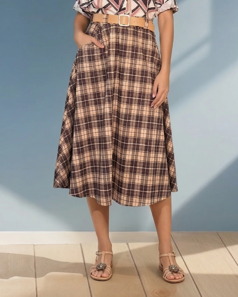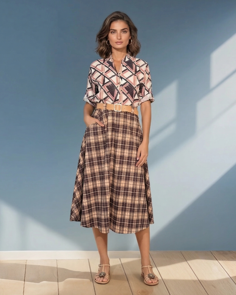 Fustă lungă cloș cu buzunare și carouri negru este o piesă clasică și versatilă, ideală pentru ținute elegante sau casual. Croiala cloș oferă fluiditate și un plus de rafinament, iar imprimeul în carouri completează stilul modern.