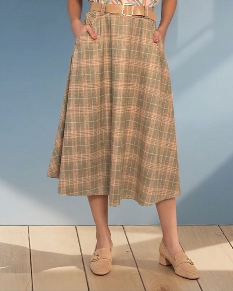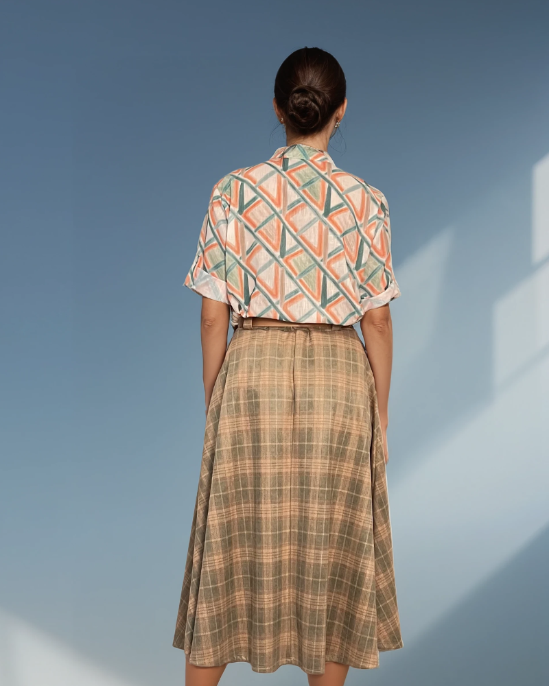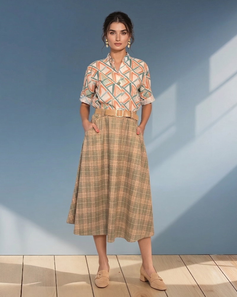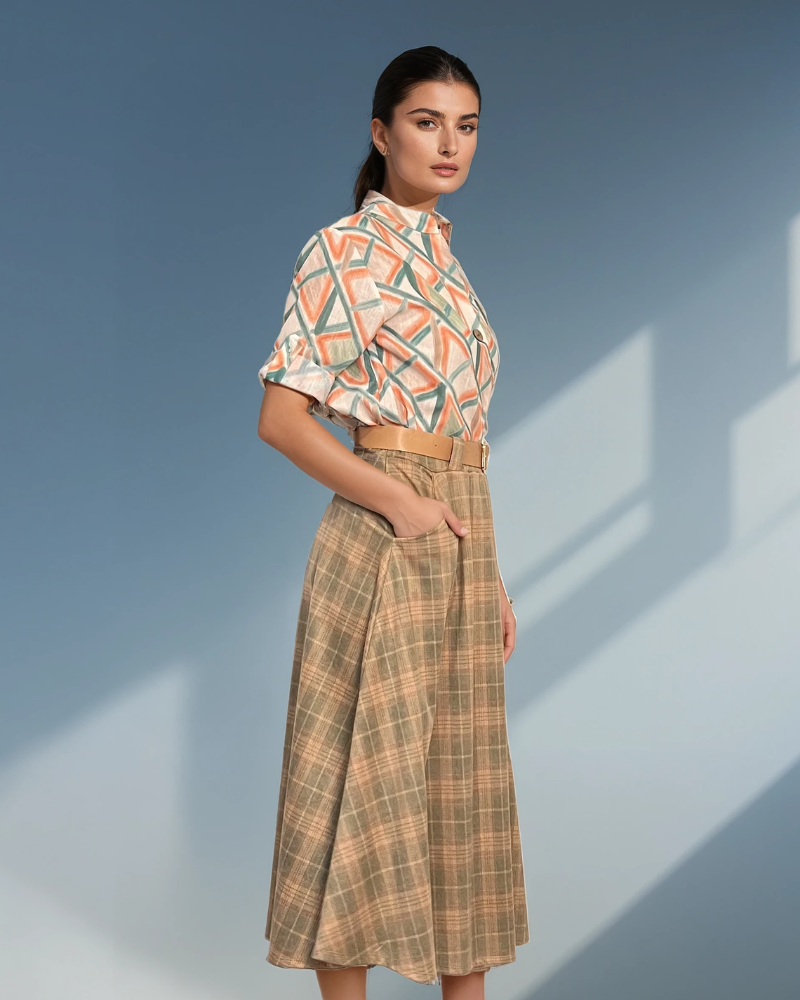 Fustă lungă cloș cu buzunare și carouri vernil aduce un plus de prospețime și stil garderobei tale. Croiala amplă oferă un efect elegant în mișcare, iar imprimeul în carouri păstrează un echilibru între clasic și modern.