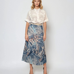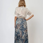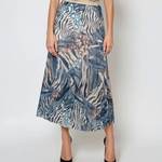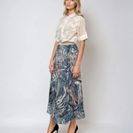 Fustă lungă plisată cu bandă elastică în talie albastru jeans print abstract îmbină stilul casual cu un imprimeu artistic modern. Nuanțele de albastru inspirate din denim fac fusta ușor de integrat în ținutele de zi. Voalul fin și talia cu detalii aurii oferă un echilibru perfect între confort și stil contemporan.