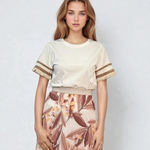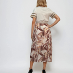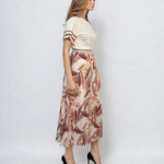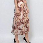 Fustă lungă plisată cu bandă elastică în talie beige este alegerea potrivită pentru un look natural, relaxat și rafinat. Imprimeul floral subtil pe fundal neutru oferă versatilitate, iar pliurile vaporoase din voal creează mișcare grațioasă. Banda elastică lată cu irizații aurii aduce un plus de eleganță în zona taliei.