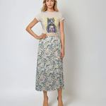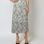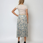 Fustă lungă plisată cu bandă elastică în talie bleu combină nuanțe răcoroase cu imprimeu floral elegant, perfectă pentru zilele însorite. Voalul fluid se mișcă frumos la fiecare pas, iar talia lată discret decorată cu irizații aurii asigură un plus de rafinament. Poart-o cu bluze vaporoase sau tricouri simple pentru un look chic effortless.