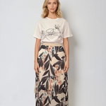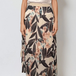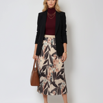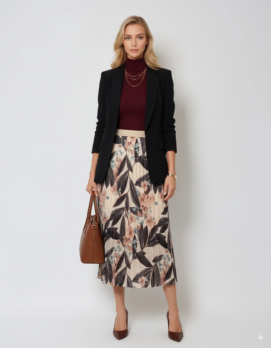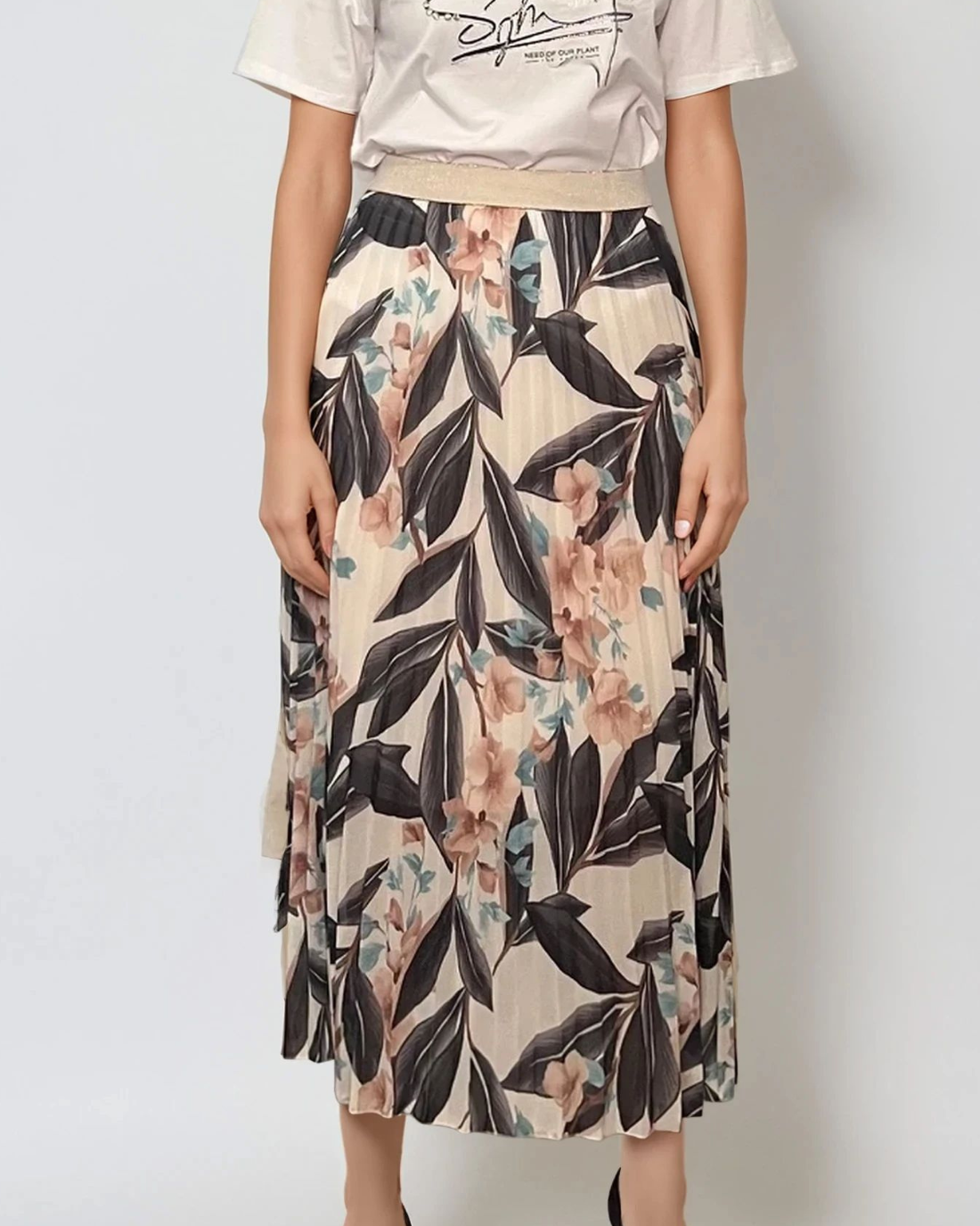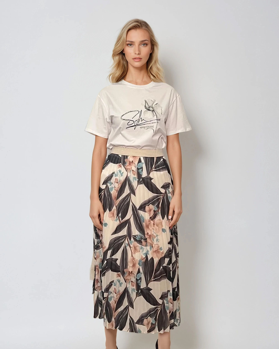 Fustă lungă plisată cu bandă elastică în talie negru-alb este alegerea perfectă pentru un look monocrom elegant cu accente florale. Imprimeul contrastant adaugă personalitate, iar voalul ușor și talia decorativă cu irizații aurii transformă această piesă într-o variantă modernă și versatilă pentru zi sau seară.