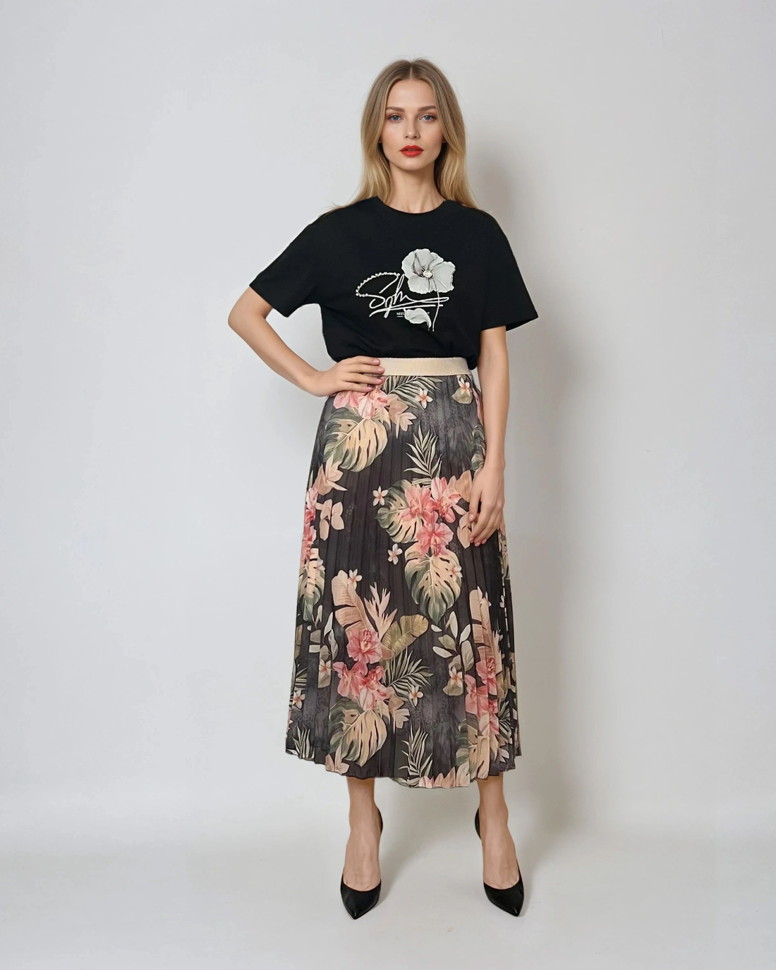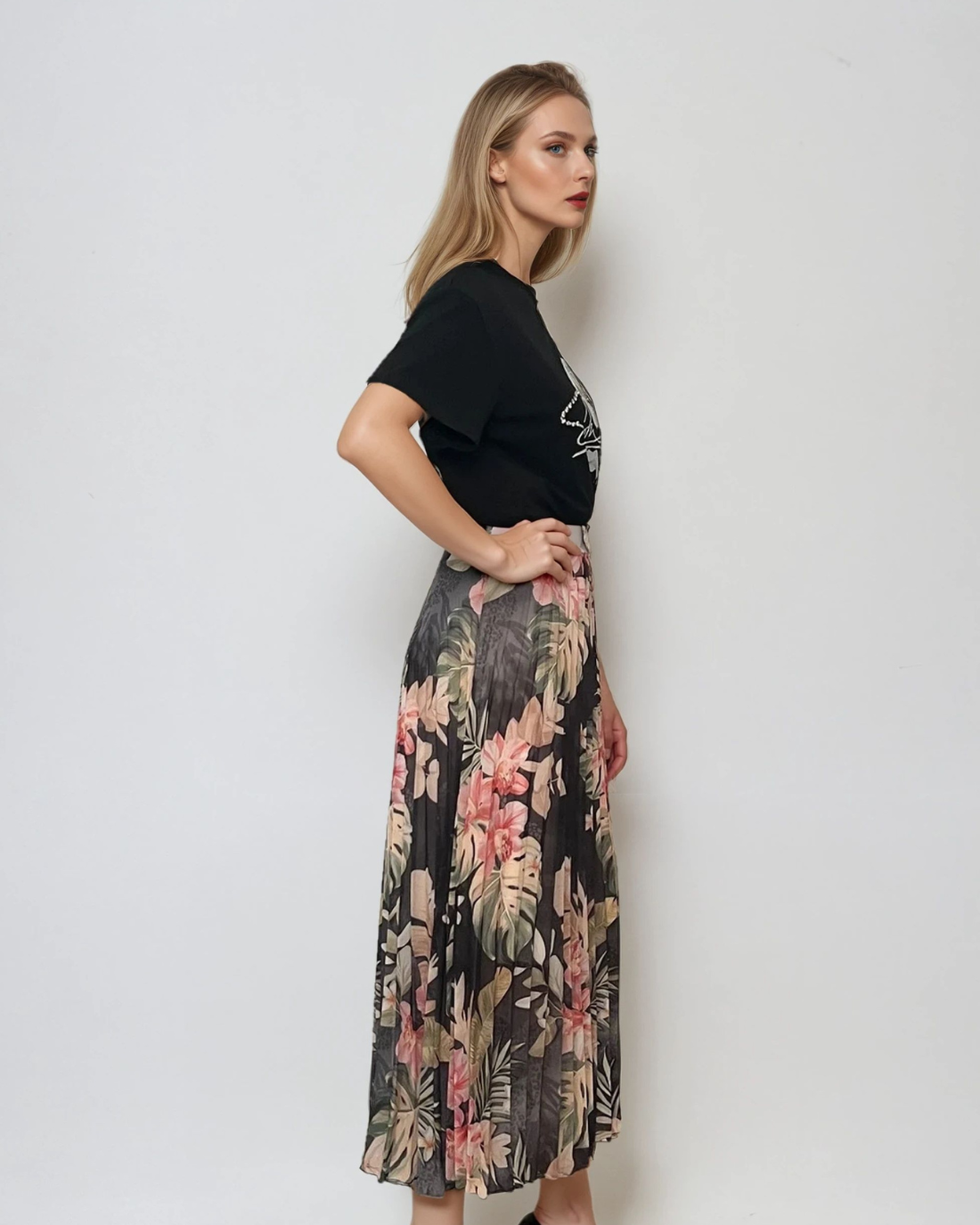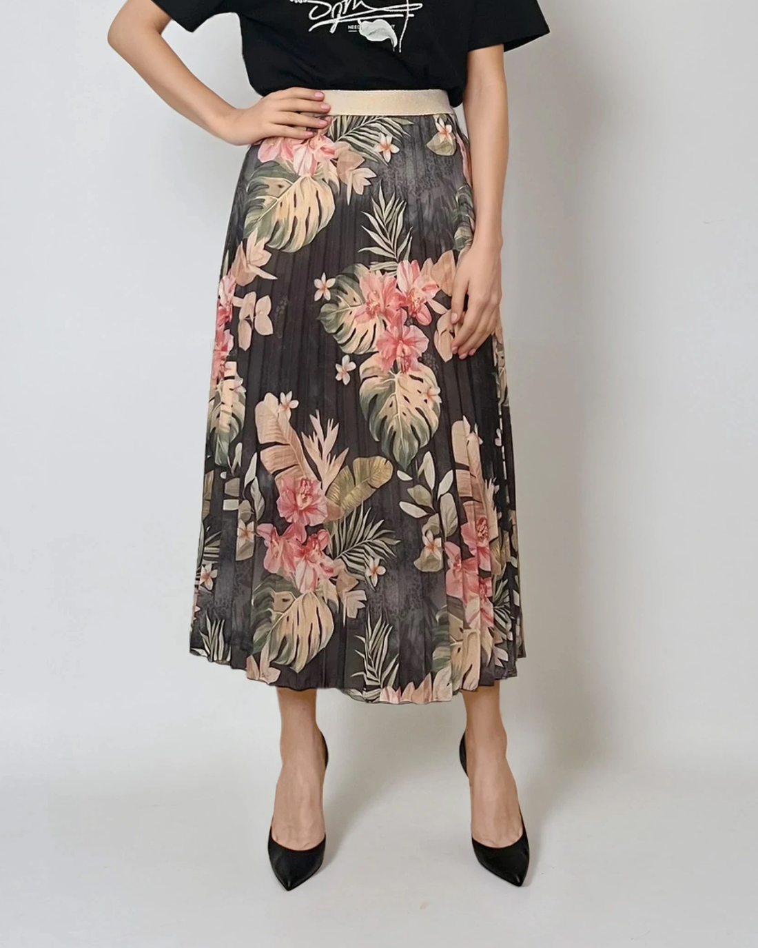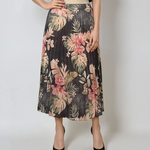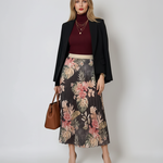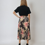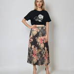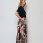 Fustă lungă plisată cu bandă elastică în talie negru-verde are un imprimeu floral în tonuri dramatice, ideal pentru ținute de seară sau stiluri boho-chic. Voalul ușor și căptușeala moale oferă lejeritate, iar talia decorativă cu irizații aurii completează armonios piesa.