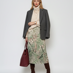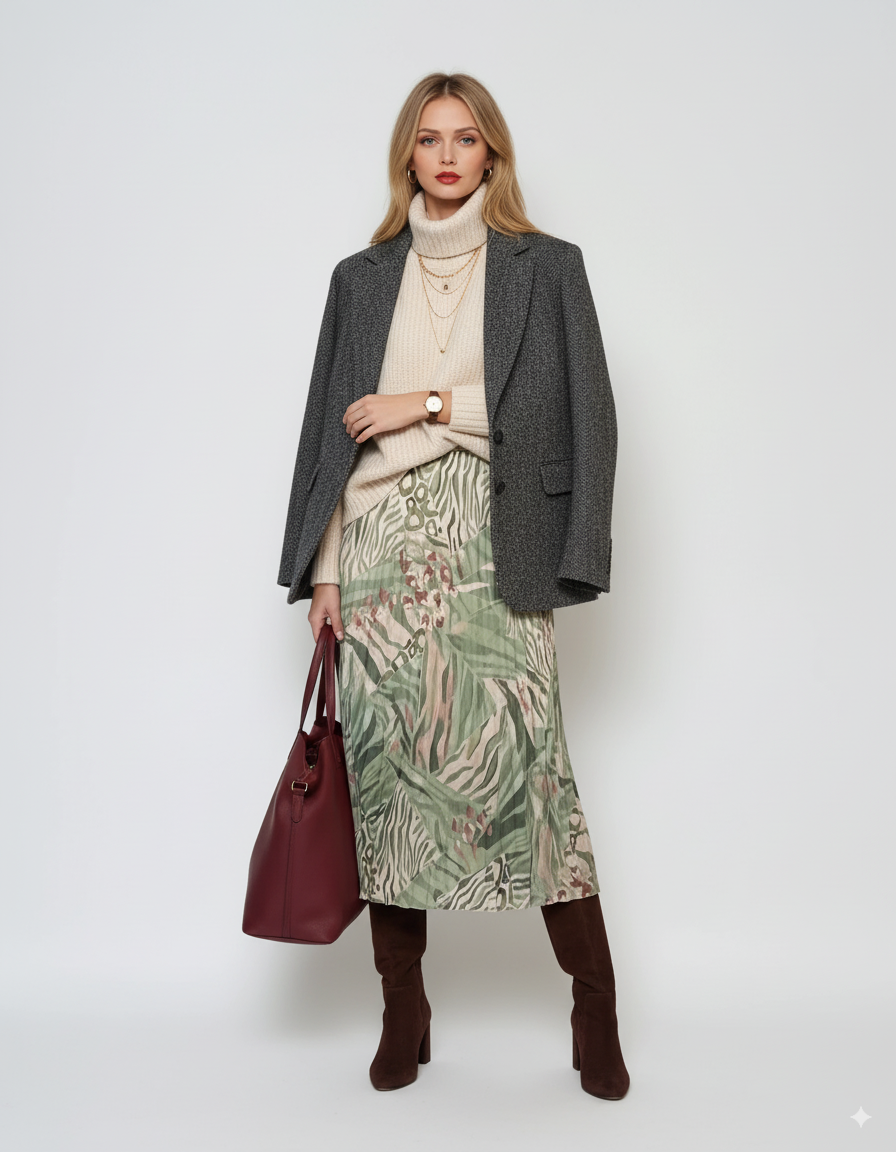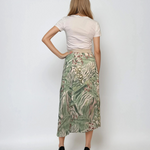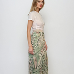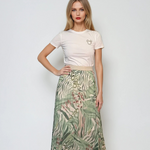 Fustă lungă plisată cu bandă elastică în talie vernil aduce prospețime și culoare în garderoba de vară. Imprimeul floral delicat în tonuri verzi se potrivește perfect cu bluze albe sau topuri fluide. Pliurile vaporoase și talia aurie oferă un echilibru între confort și stil feminin.