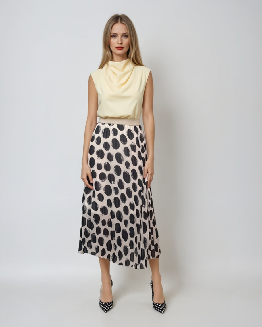 Fustă lungă plisată cu buline și bandă elastică alb-negru combină eleganța clasică a contrastului alb-negru cu o croială fluidă și feminină. Bulinele de dimensiuni variate adaugă dinamism, iar banda elastică oferă confort. O alegere versatilă pentru birou sau ocazii speciale.