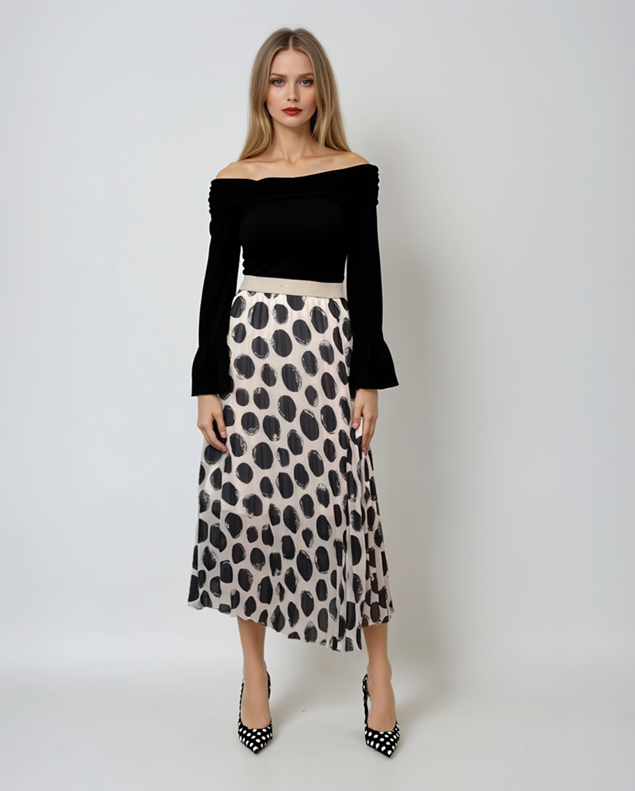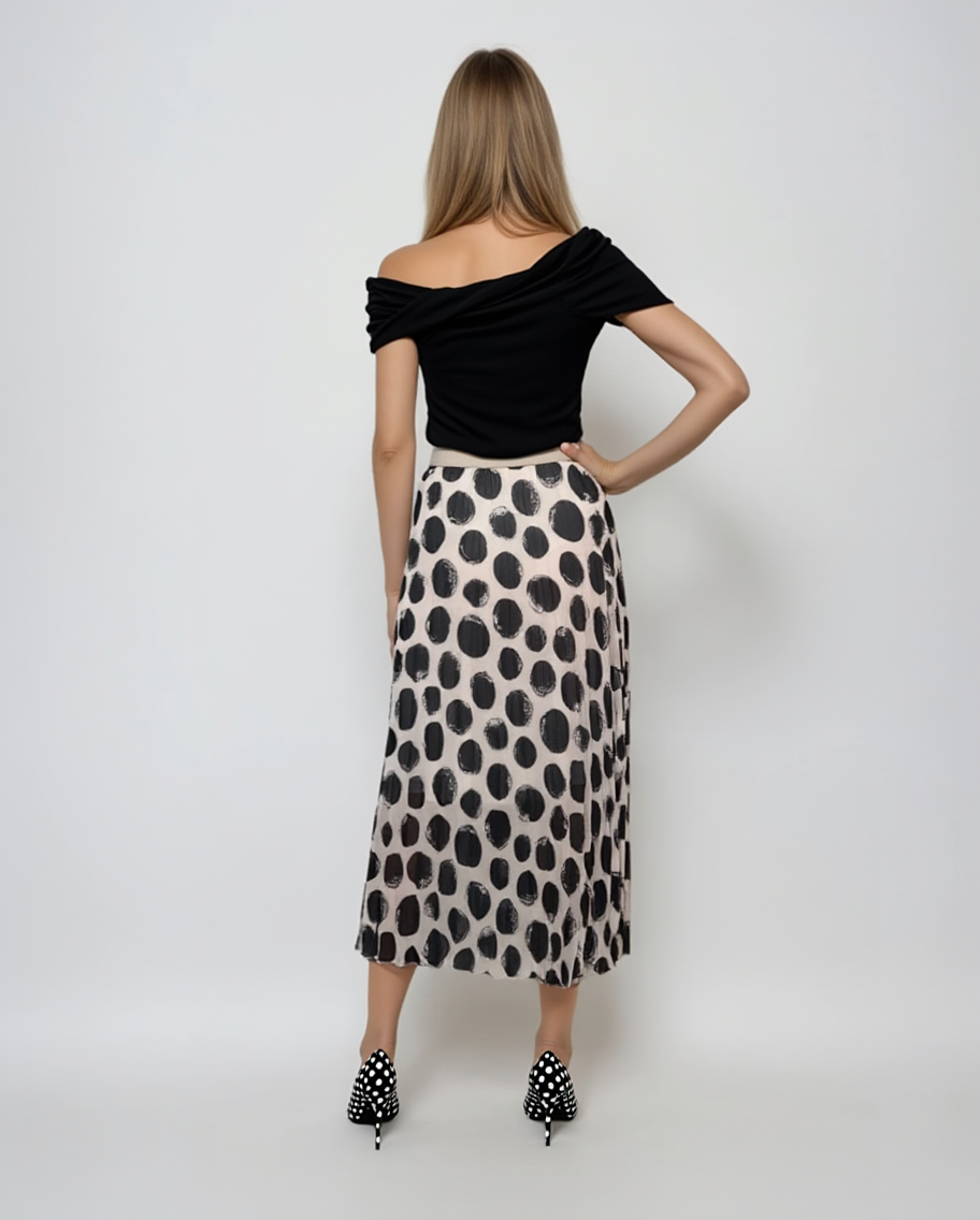 Fustă lungă plisată cu buline și bandă elastică alb-negru