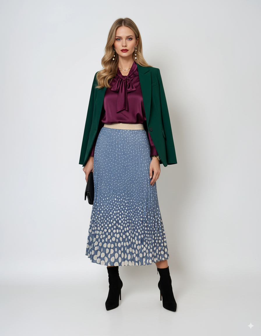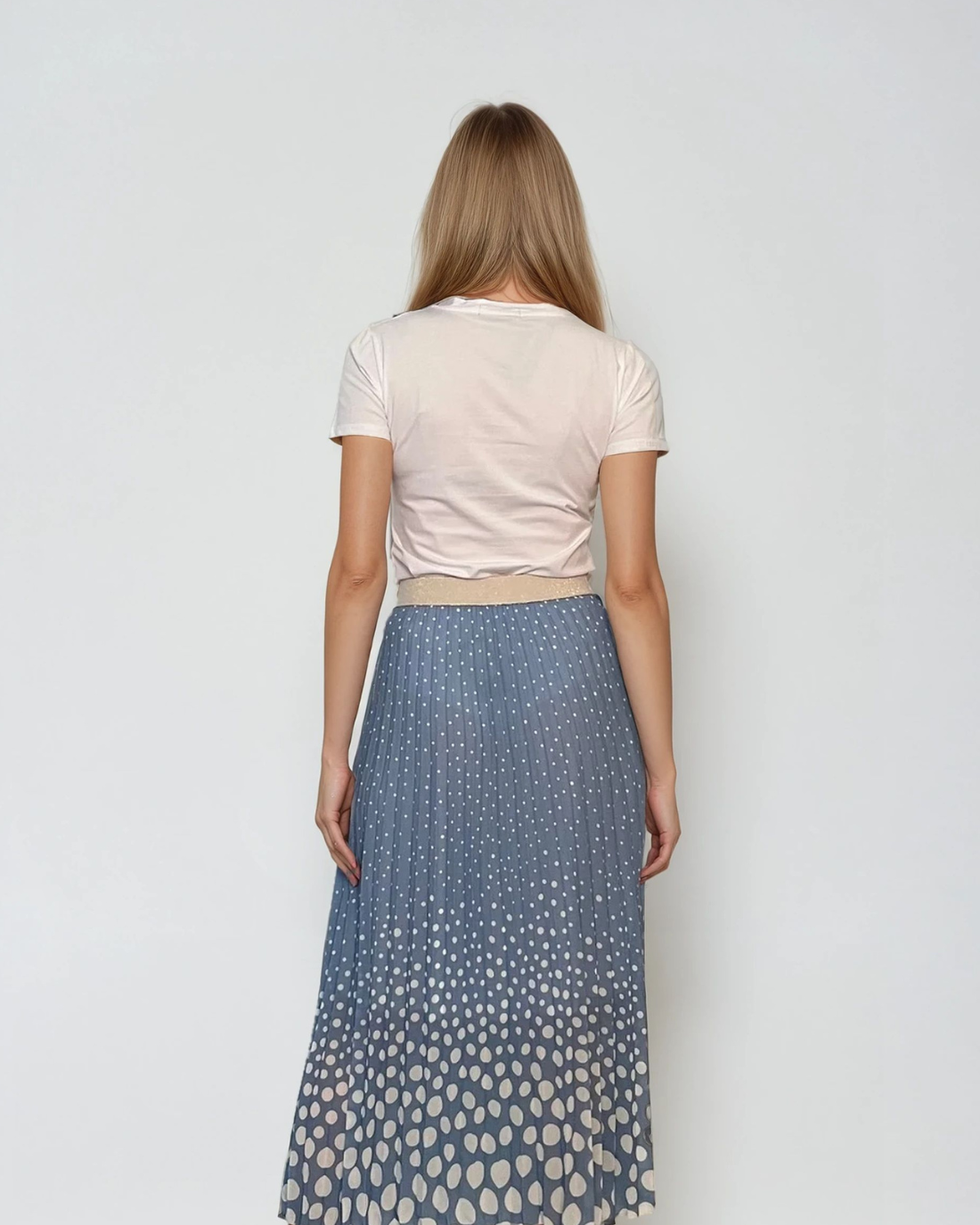 Fustă lungă plisată cu buline și bandă elastică albastru jeans este alegerea ideală pentru un look casual-modern. Nuanța inspirată de denim și croiala amplă o fac perfectă pentru ținute urbane relaxate. Căptușeala moale asigură confort în mișcare zi de zi.