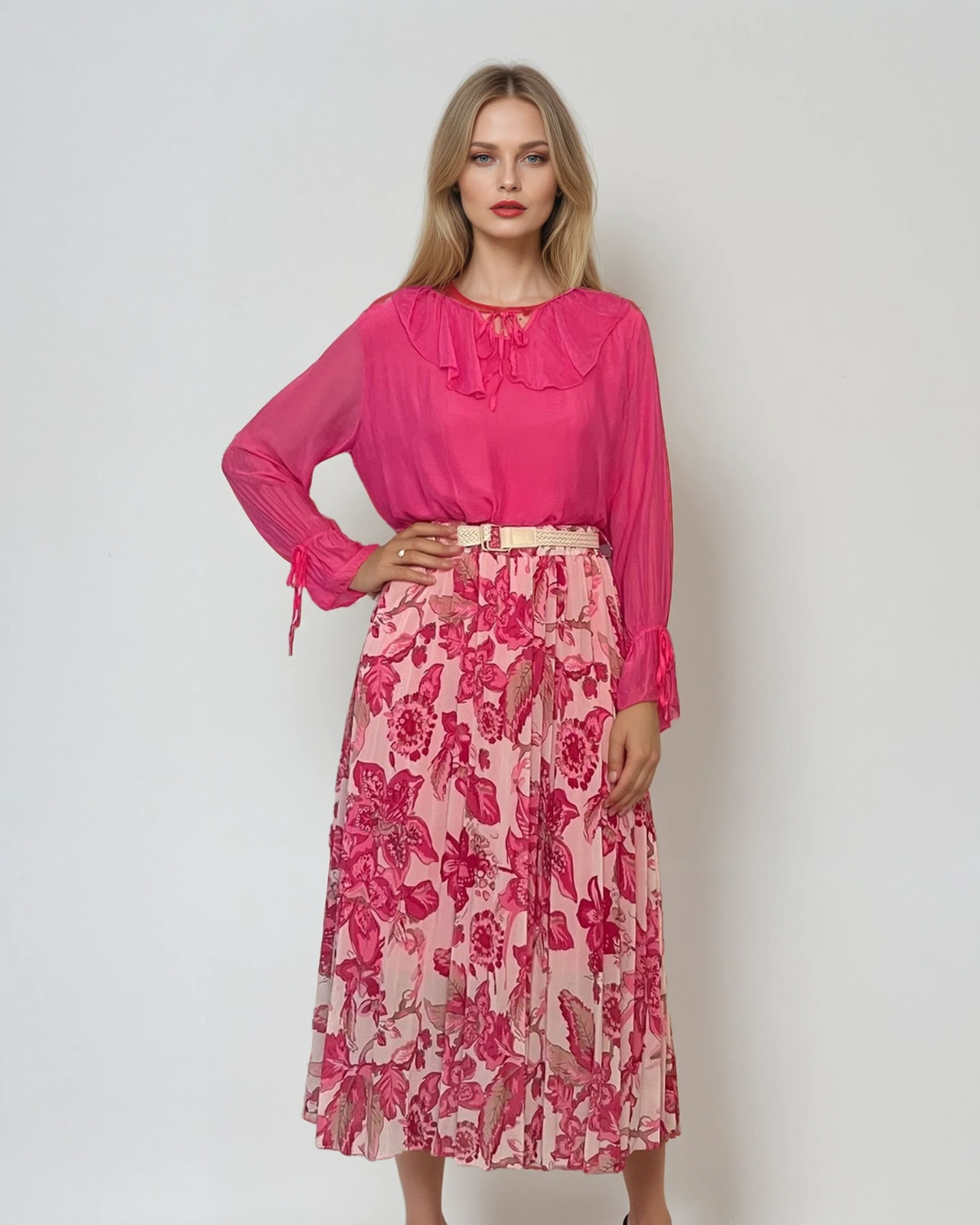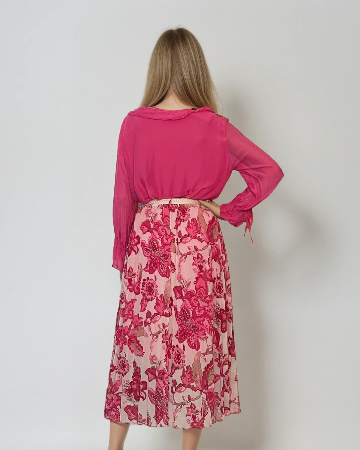Fustă lungă plisată cu curea și print floral ciclam atrage privirile prin culoarea intensă și croiala lejeră. Cureaua inclusă accentuează talia, iar pliurile vaporoase din voal conferă dinamism și eleganță. Ideală pentru evenimente de zi sau ieșiri casual pline de stil.