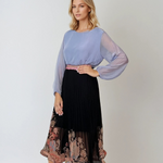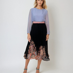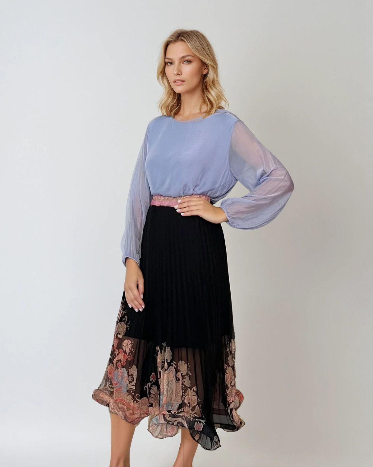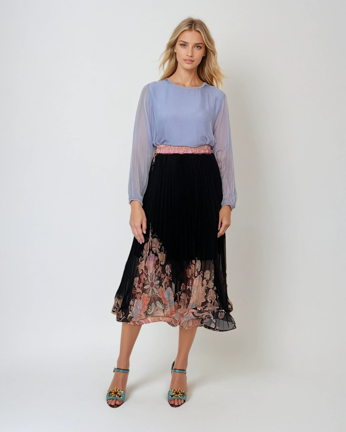 Fustă lungă neagră plisată cu print floral subtil, completată de o crinolină fluidă la bază care adaugă volum și mișcare elegantă. Croiala lejeră și talia elastică oferă confort sporit, fiind ideală pentru ocazii speciale și evenimente festive.