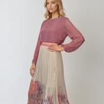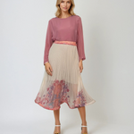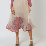 Fustă lungă plisată cu print floral și crinolină fluidă roz