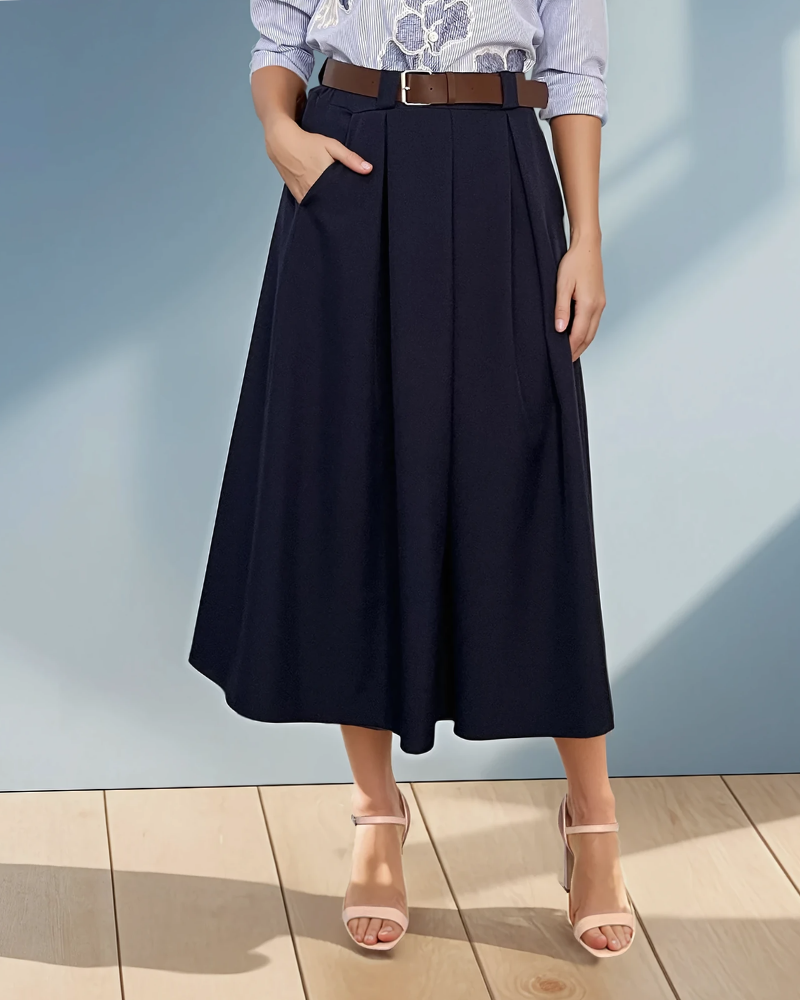 Fustă midi cu buzunare și curea bleumarin este o piesă clasică și elegantă, ideală pentru ținute sofisticate de zi sau office. Nuanța profundă oferă rafinament, iar designul cu buzunare și curea adaugă un plus de stil.