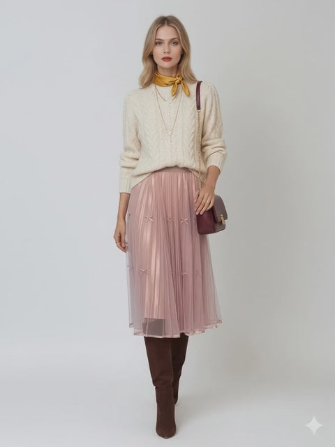 Fustă midi din tulle cu fundițe și aspect satinat roz, ce aduce un aer jucăuș și romantic ținutelor de ocazie. Materialul delicat și croiala vaporosă oferă un plus de feminitate și mișcare plăcută.