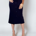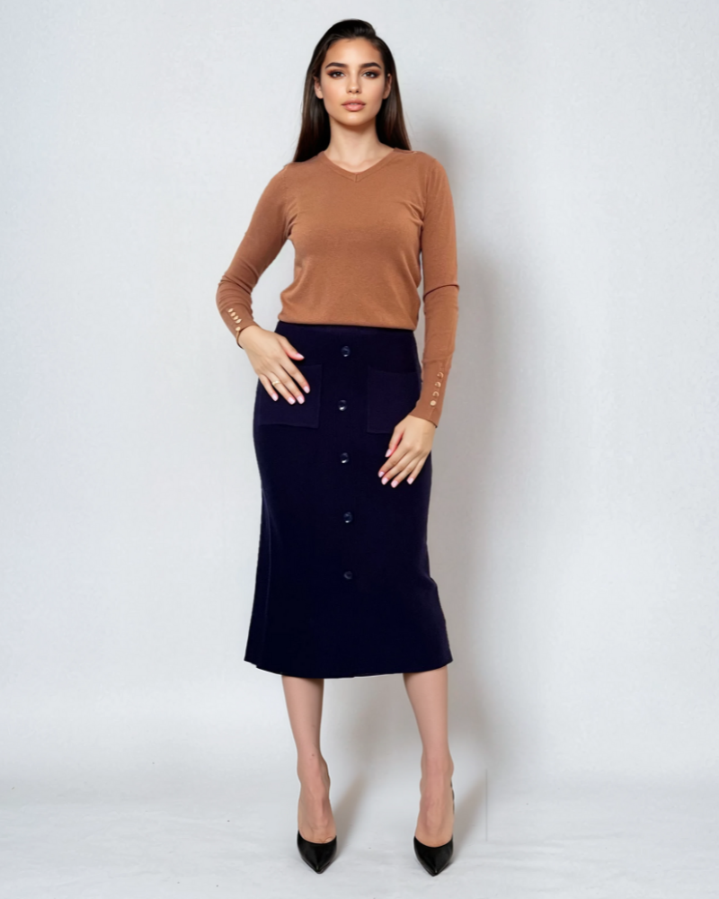 Fustă midi tricotată cu buzunare bleumarin este o piesă elegantă și practică. Buzunarele laterale adaugă funcționalitate, iar tricotul elastic urmează delicat linia corpului. Nasturii mari oferă un detaliu vizual de efect.