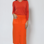 Fustă midi tricotată cu buzunare portocaliu atrage prin culoarea intensă și croiala practică. Buzunarele laterale sunt discrete și utile, iar nasturii mari adaugă o notă decorativă. Perfectă pentru un look cozy și vesel de toamnă.