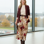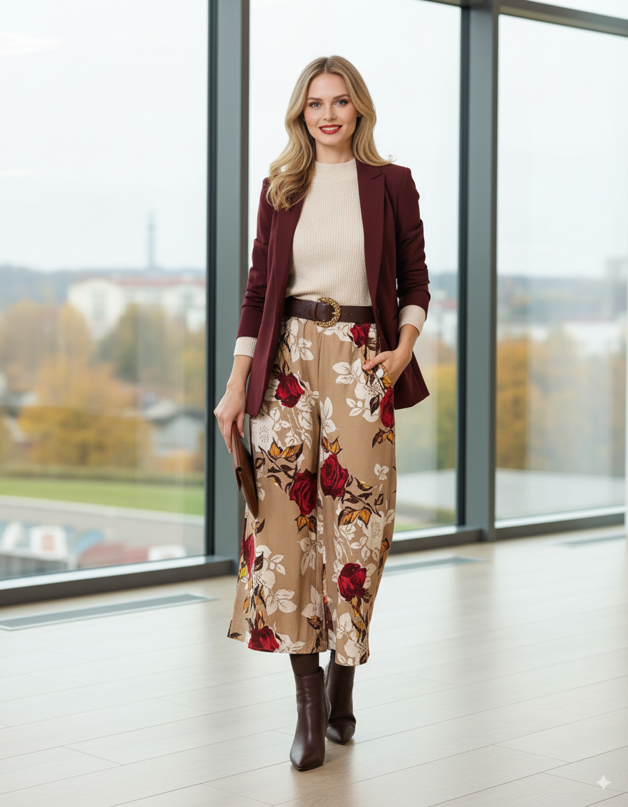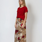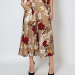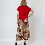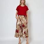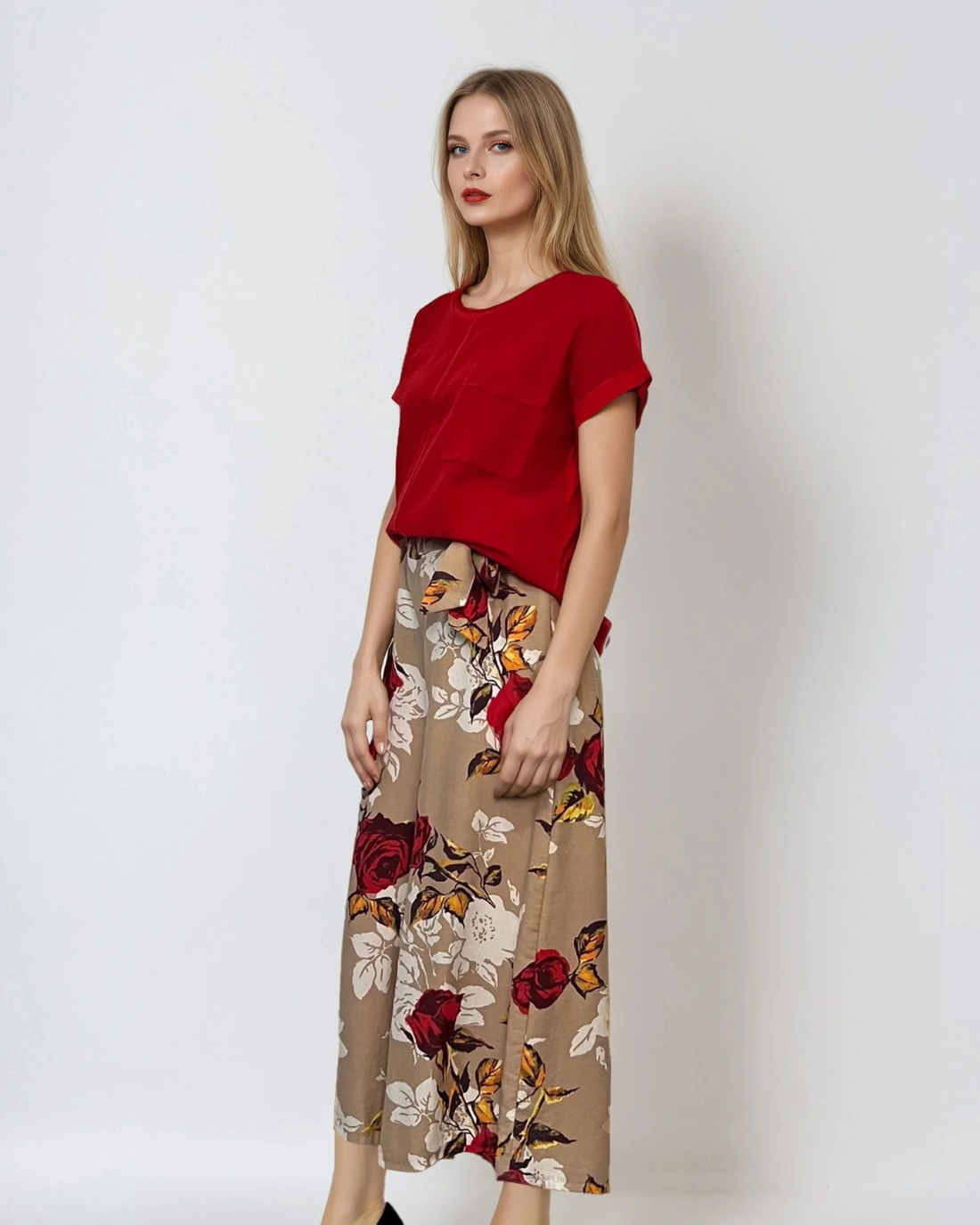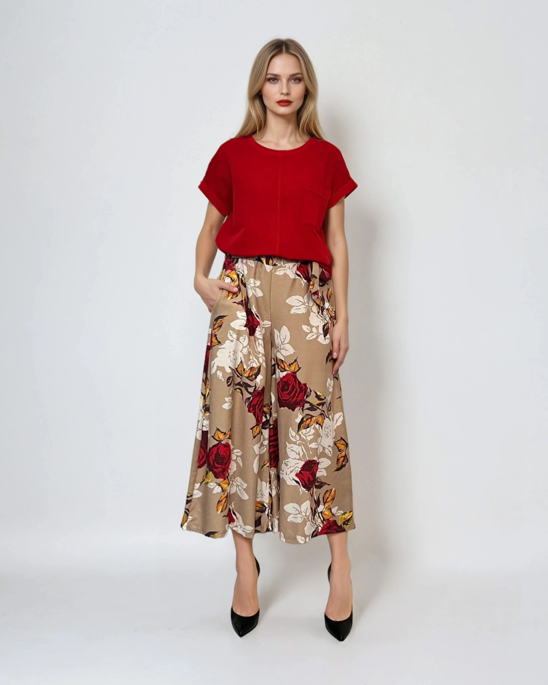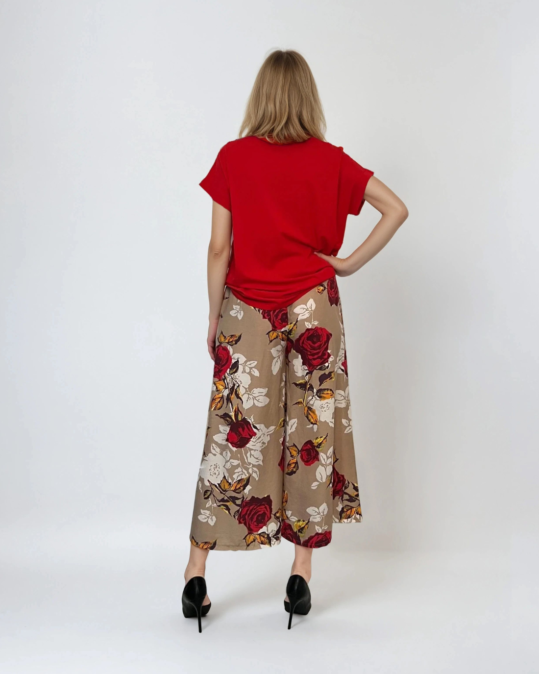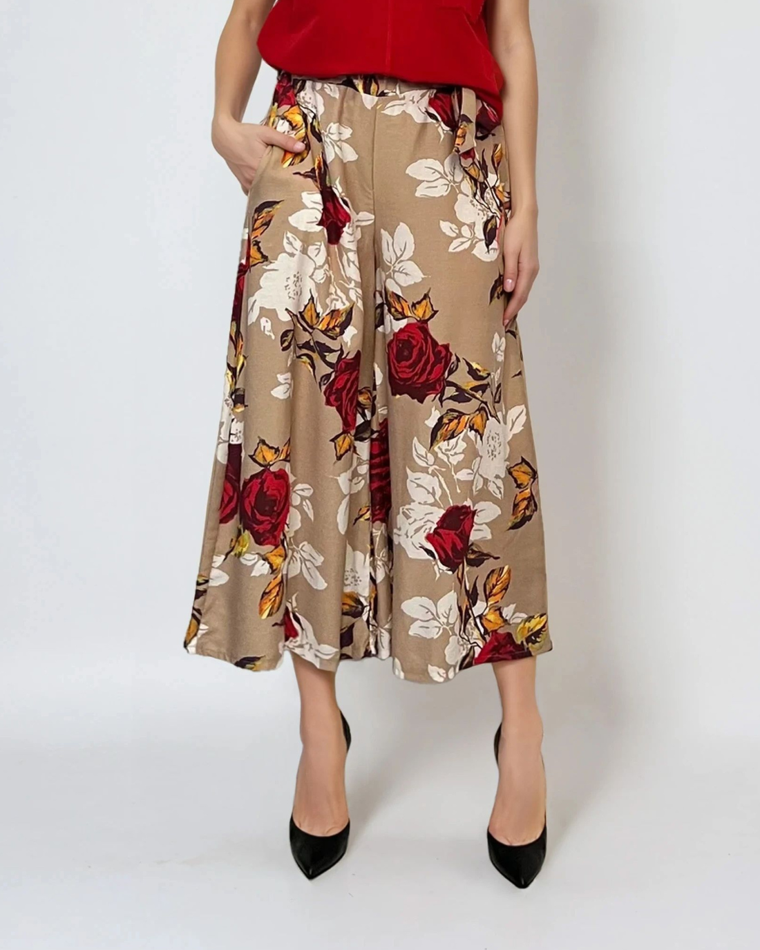 Fustă pantaloni largi bej cu print floral mare, realizată dintr-un mix natural de in și vâscoză, oferind un confort sporit și un aspect rafinat. Elasticul și șnurul din talie asigură ajustarea ideală, iar buzunarele adaugă un plus de practicitate.
