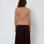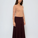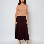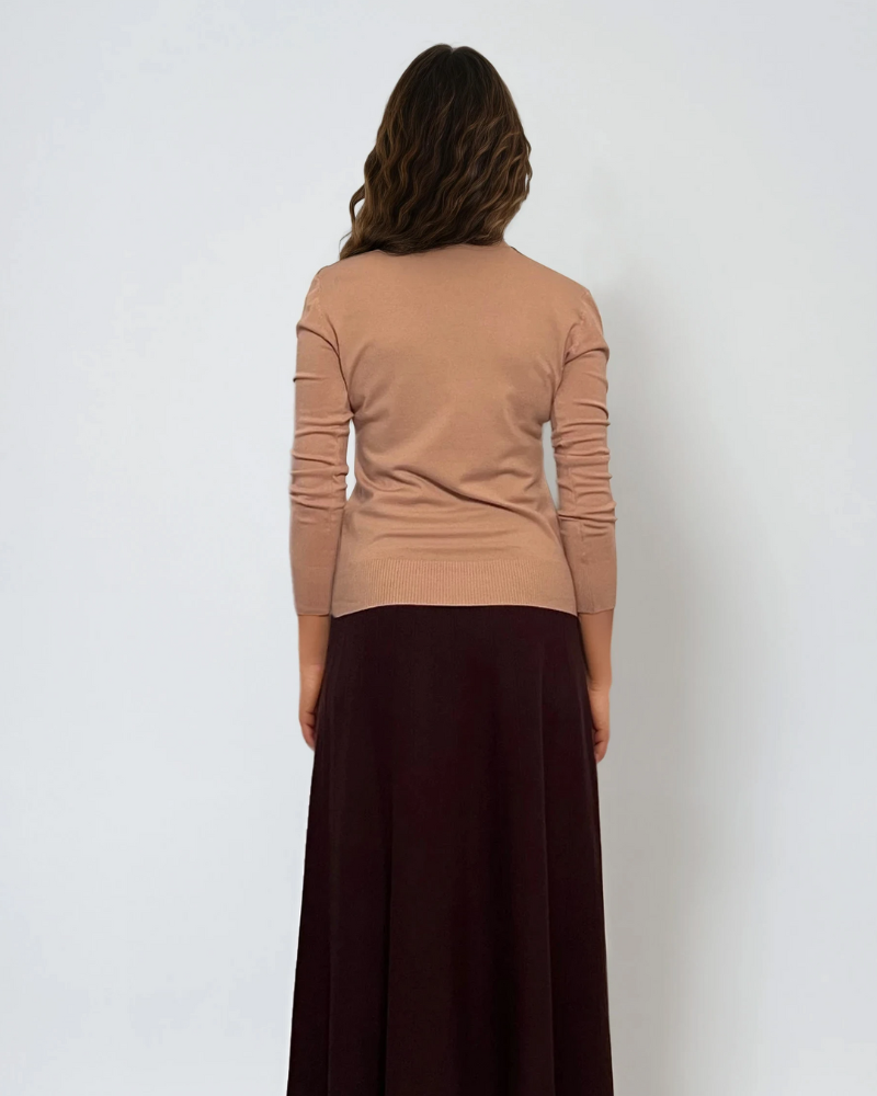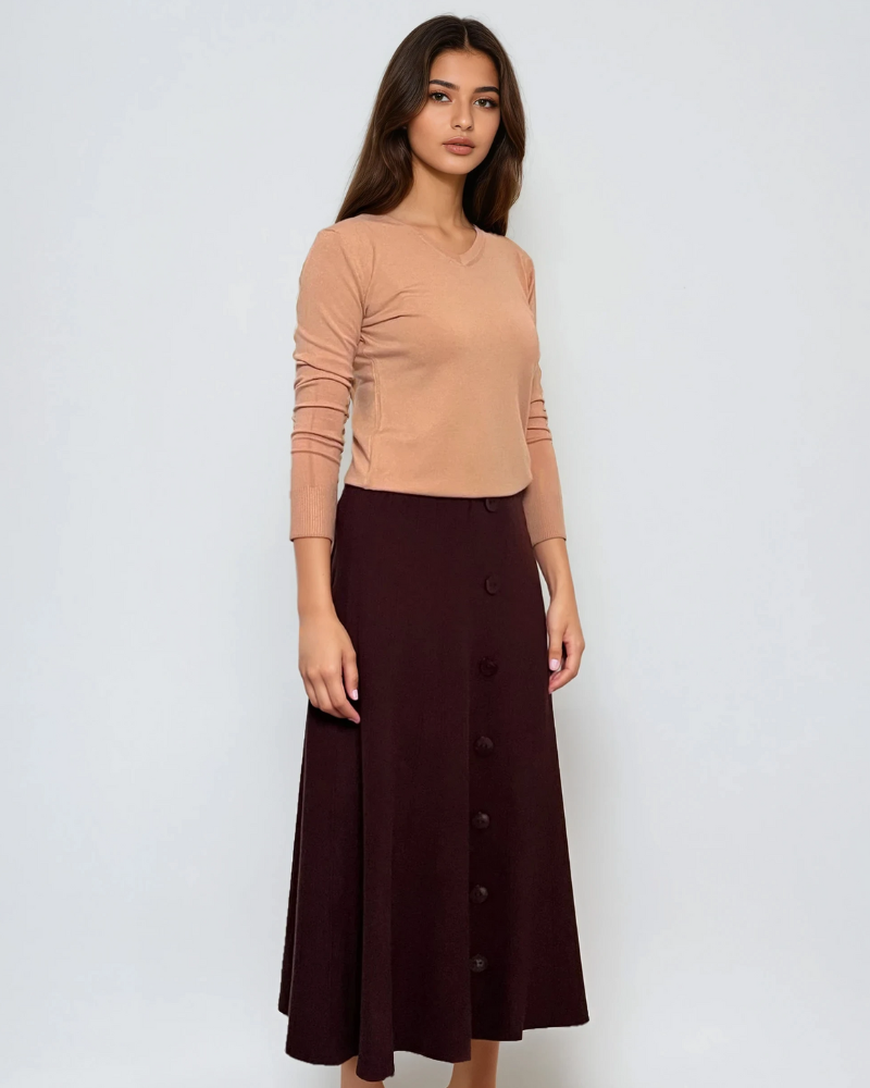 Fustă tricotată cloș cu nasturi maro este piesa ideală pentru sezonul de toamnă, având o nuanță caldă și plăcută. Designul cu nasturi și croiala cloș o fac ușor de purtat și extrem de feminină.