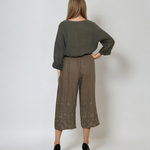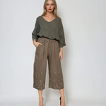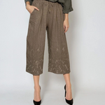 Pantaloni 3/4 din in cu broderie florală și buzunare grej sunt piesa perfectă pentru o ținută de vară calmă și feminină. Culoarea neutră îi face ușor de integrat în combinații simple, iar broderia adaugă un plus de stil și delicatețe.