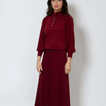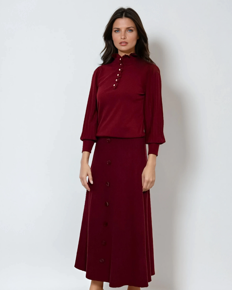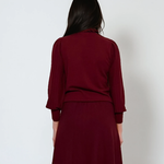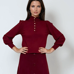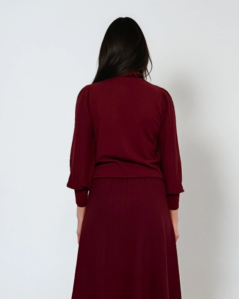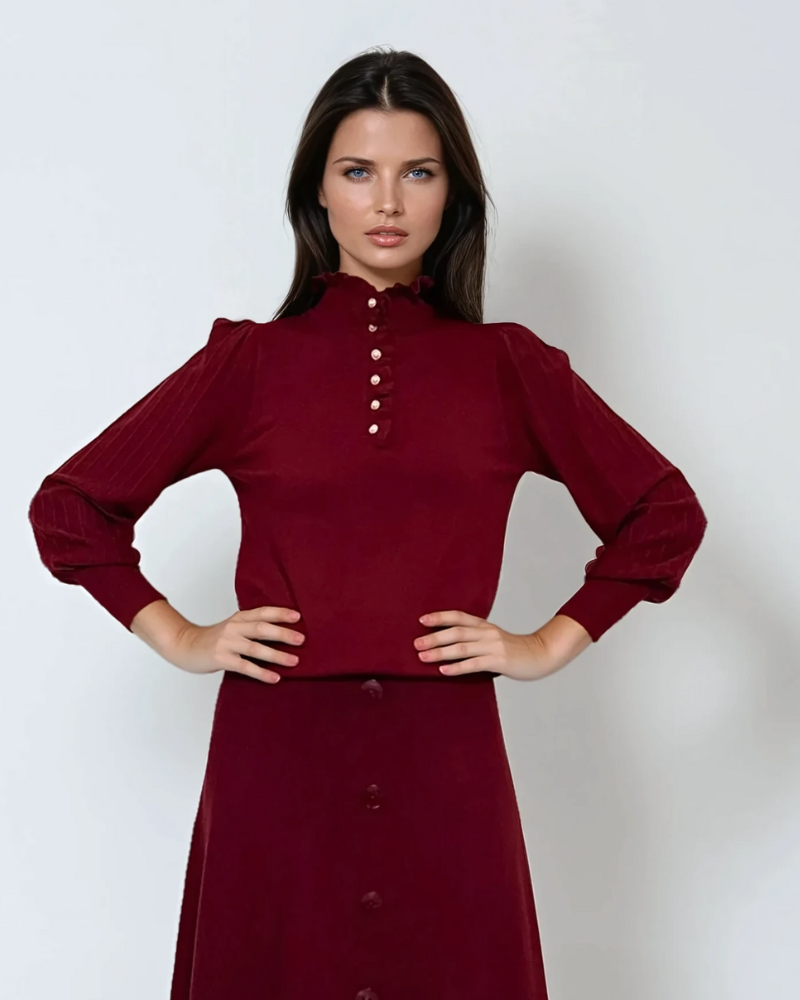 Pulover cu mâneci bufante și guler încrețit grena adaugă un strop de rafinament în garderoba de toamnă-iarnă. Culoarea bogată se potrivește perfect cu detalii elegante, precum nasturii de pe guler.