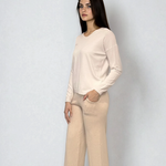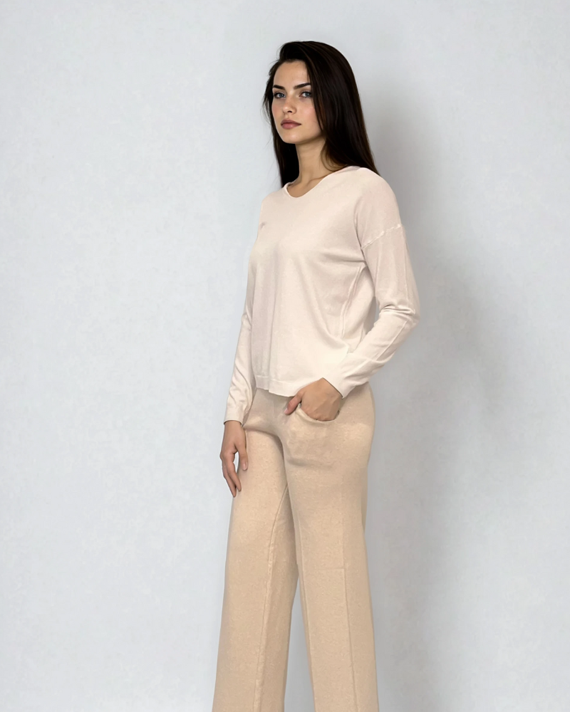 Puloverul en-coeur cu nasturi pe mâneci alb este o piesă de bază cu aer sofisticat. Decolteul subtil evidențiază feminitatea, iar nasturii de pe mâneci adaugă un plus de detaliu rafinat.