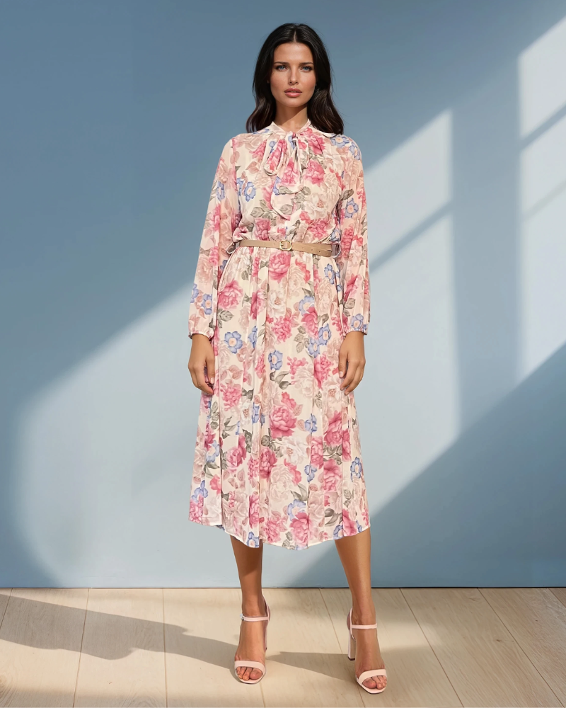 Rochie din voal cu print floral, legătură la guler și curea crem