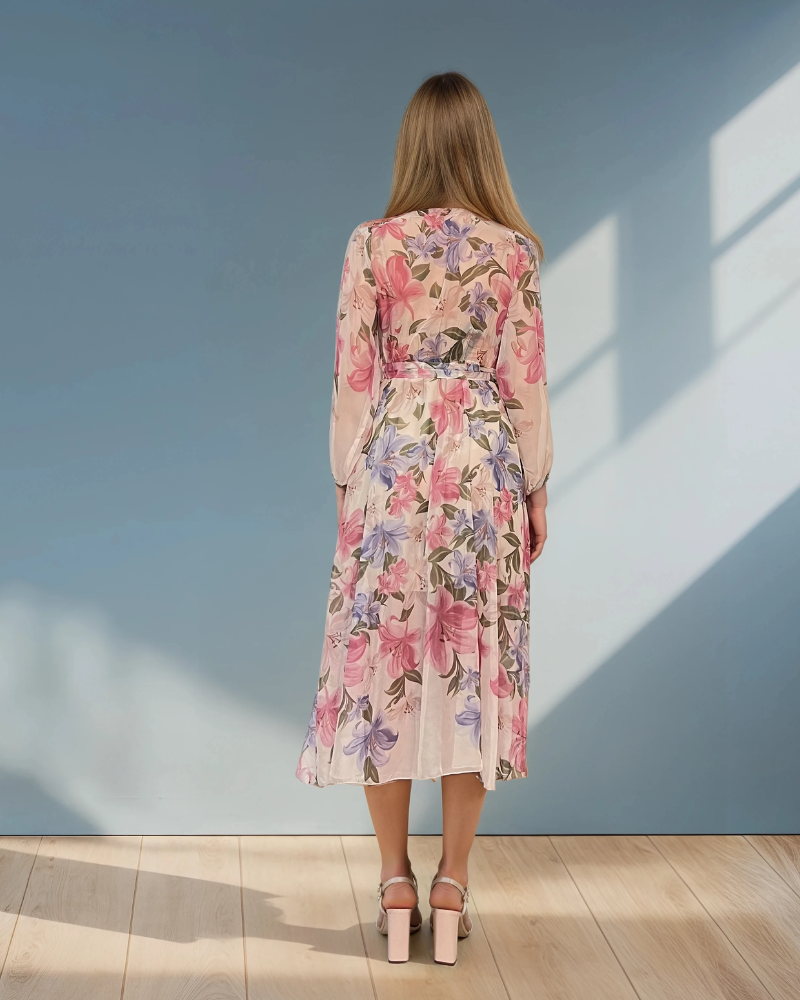 Decolteul parte peste parte oferă un aspect sofisticat și evidențiază armonios bustul, iar materialul din voal adaugă lejeritate și confort. Mânecele lungi și croiala vaporoasă transformă această rochie într-o alegere ideală pentru evenimente speciale sau ieșiri elegante.
