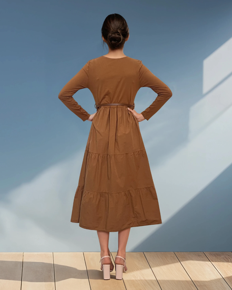Rochie lungă cu bust din bumbac și curea în talie maro