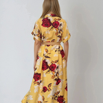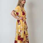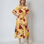 Rochie lunga galbena cu print floral, ce impresioneaza prin croiala larga si confortabila, ajustabila perfect cu centura inclusa in talie. Manecile scurte si nasturii adauga un plus de eleganta casual, ideală pentru zilele calde de vara.