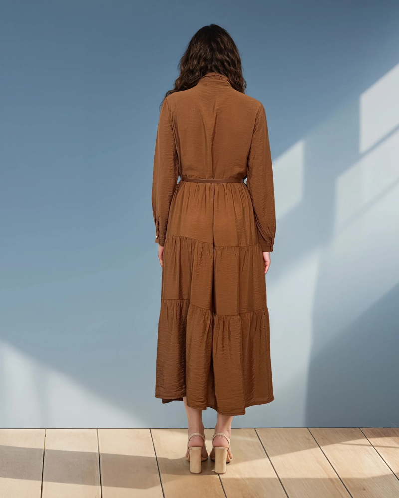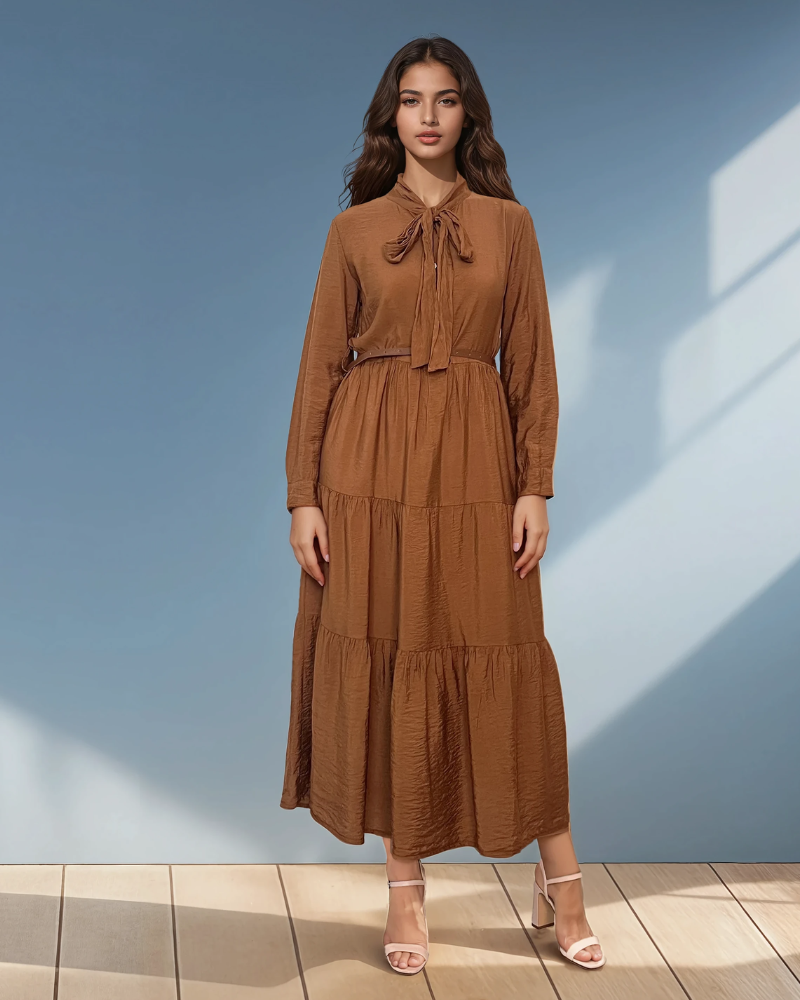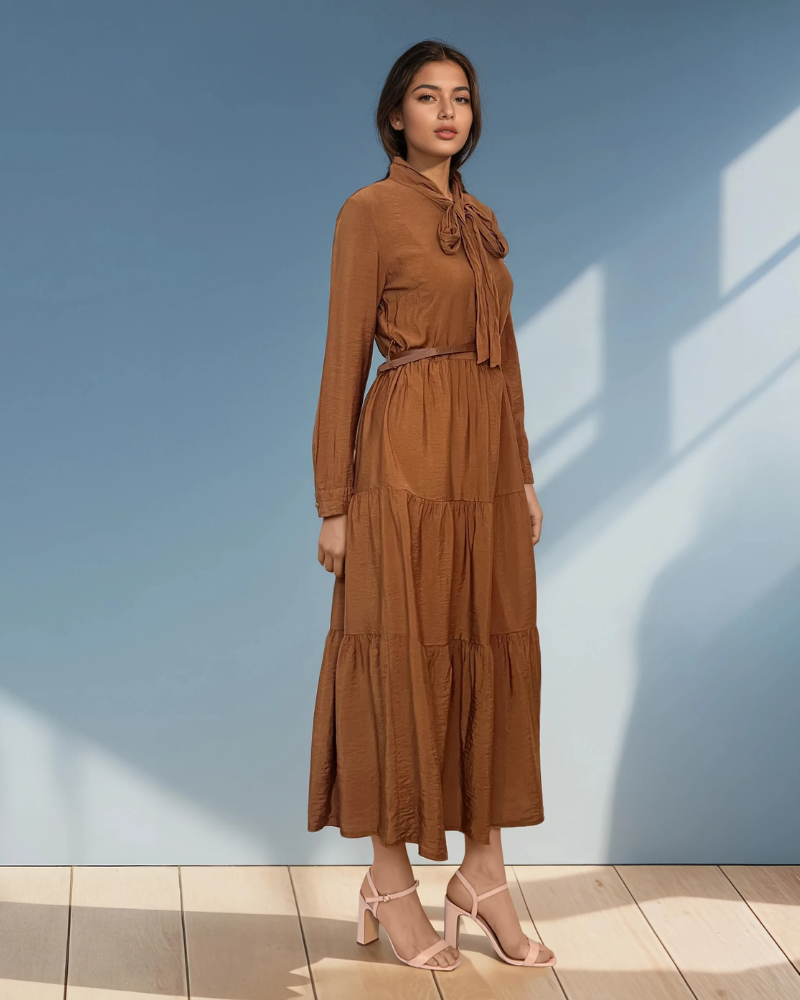 Rochie lungă cu legătură la guler și curea maro