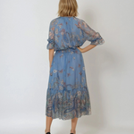 Rochie lungă din voal fluid cu volan jos și print floral albastru