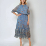 Rochie lungă albastră din voal fluid, cu volan jos și print floral vibrant, ce inspiră prospețime și eleganță. Materialul ușor și căptușeala din vâscoză asigură o senzație răcoroasă, ideală pentru evenimente de vară sau primăvară.