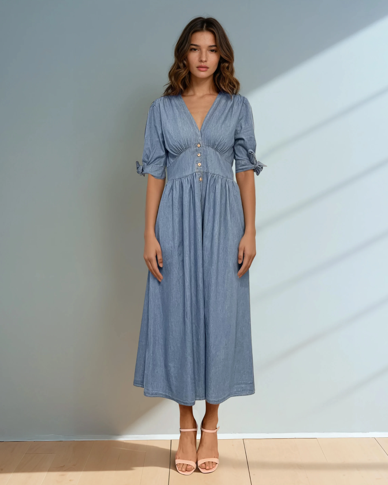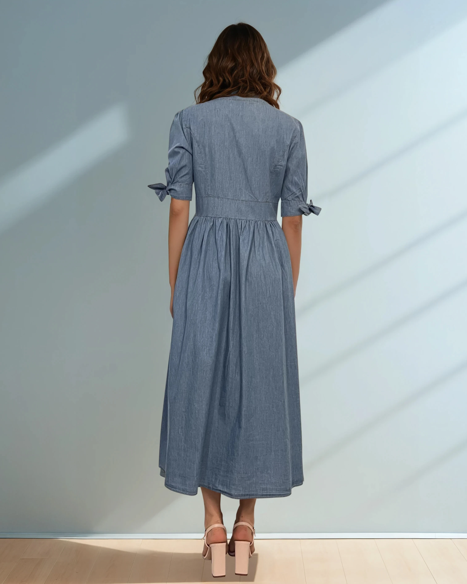 Rochie lungă jeans cu fundă la mânecă și decolteu cu nasturi albastru jeans este o piesă statement ce îmbină stilul casual cu detalii feminine delicate. Croiala lungă oferă eleganță și fluiditate, iar textura denim adaugă un aer modern și versatil.