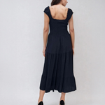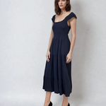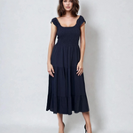 Rochie lungă mulată cu bretele crețe bleumarin este alegerea ideală pentru o apariție rafinată și ușor misterioasă. Nuanța intensă de bleumarin avantajeaz
