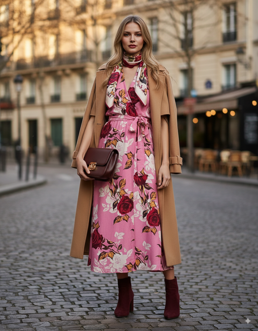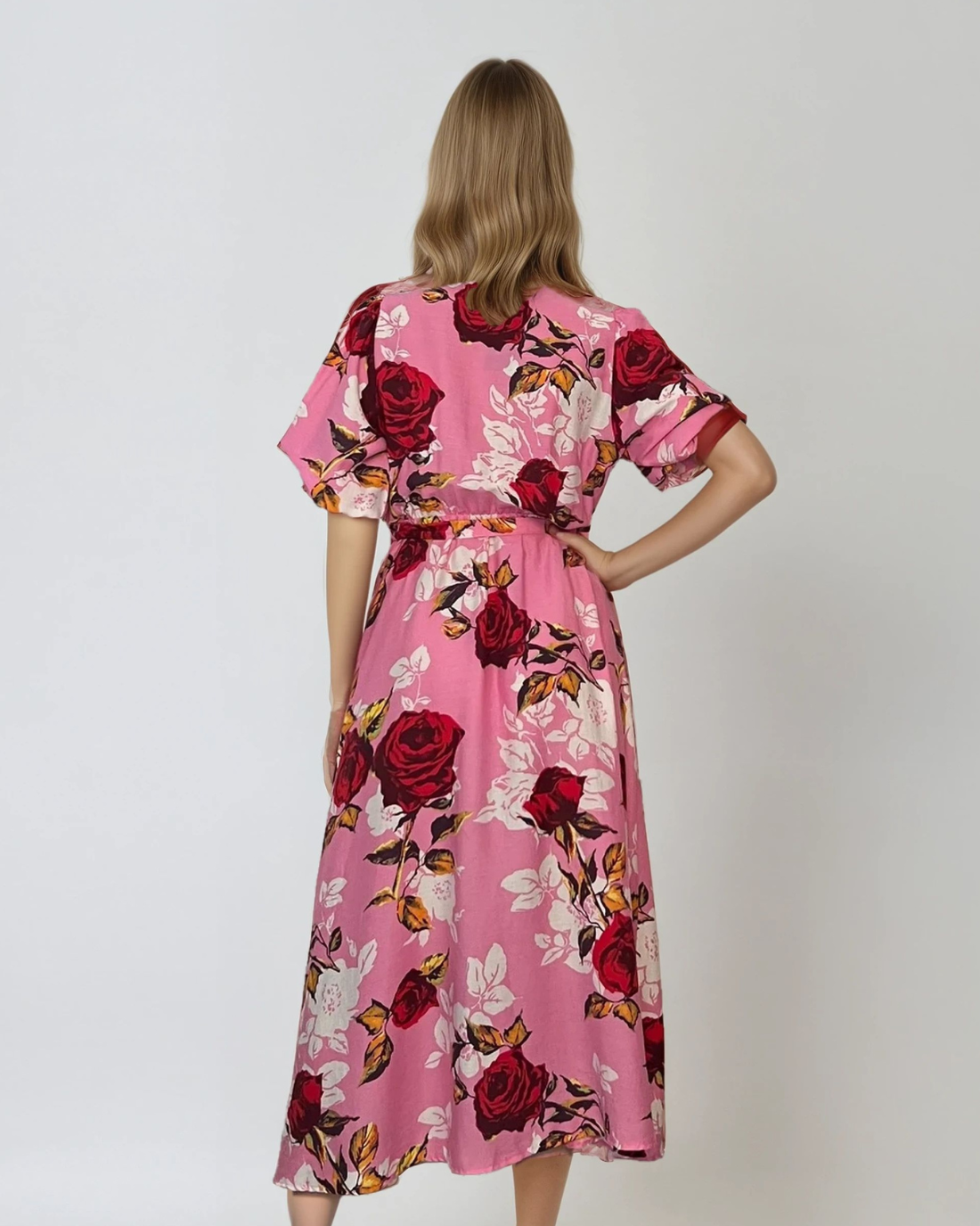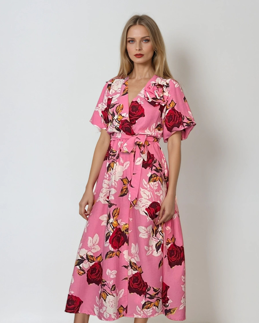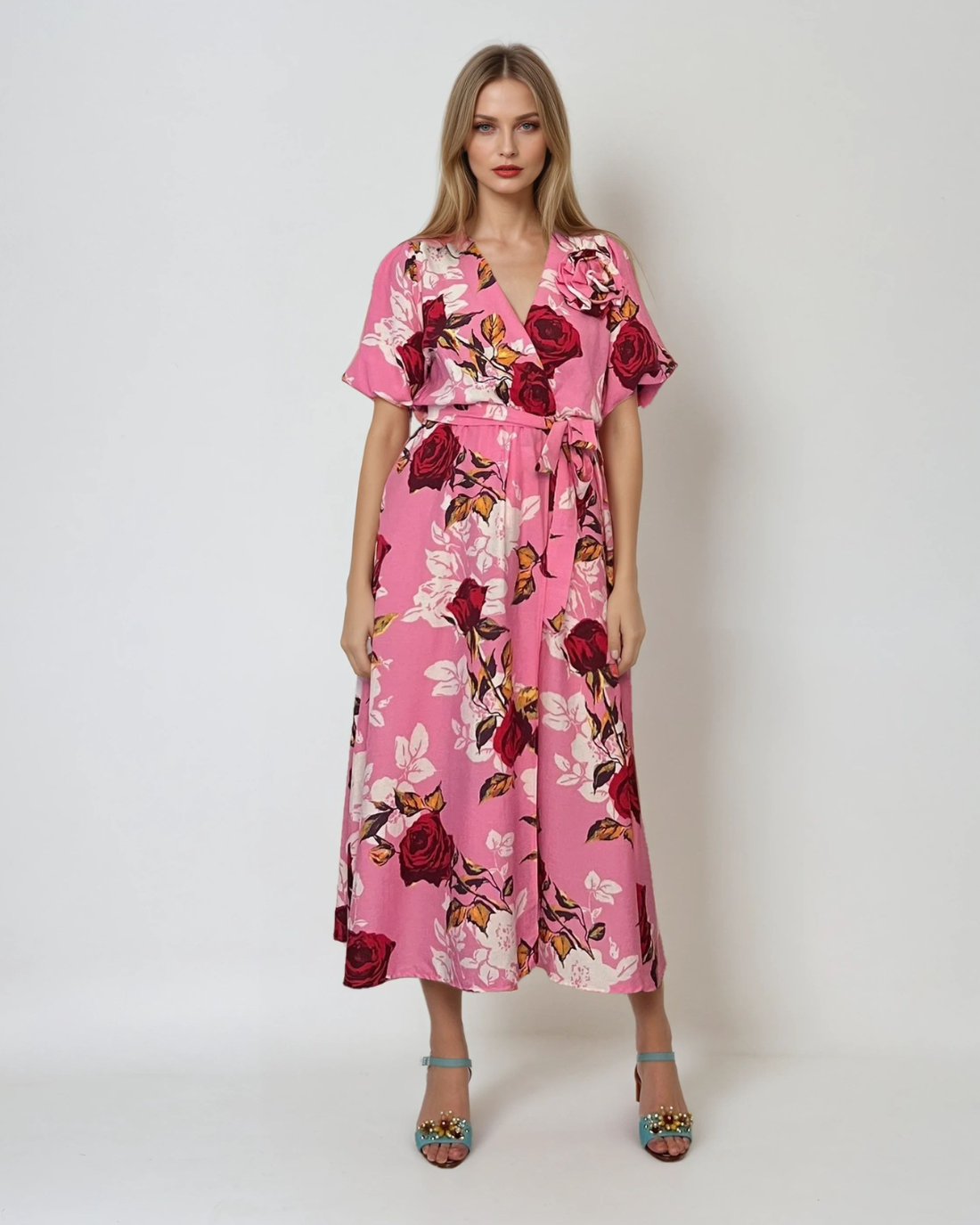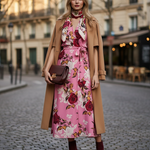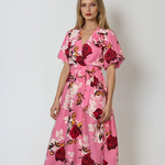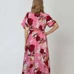 Rochie lunga parte peste parte print floral cu broșă roz