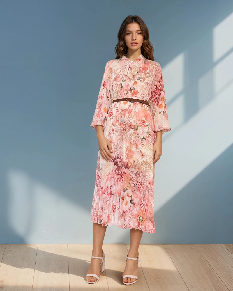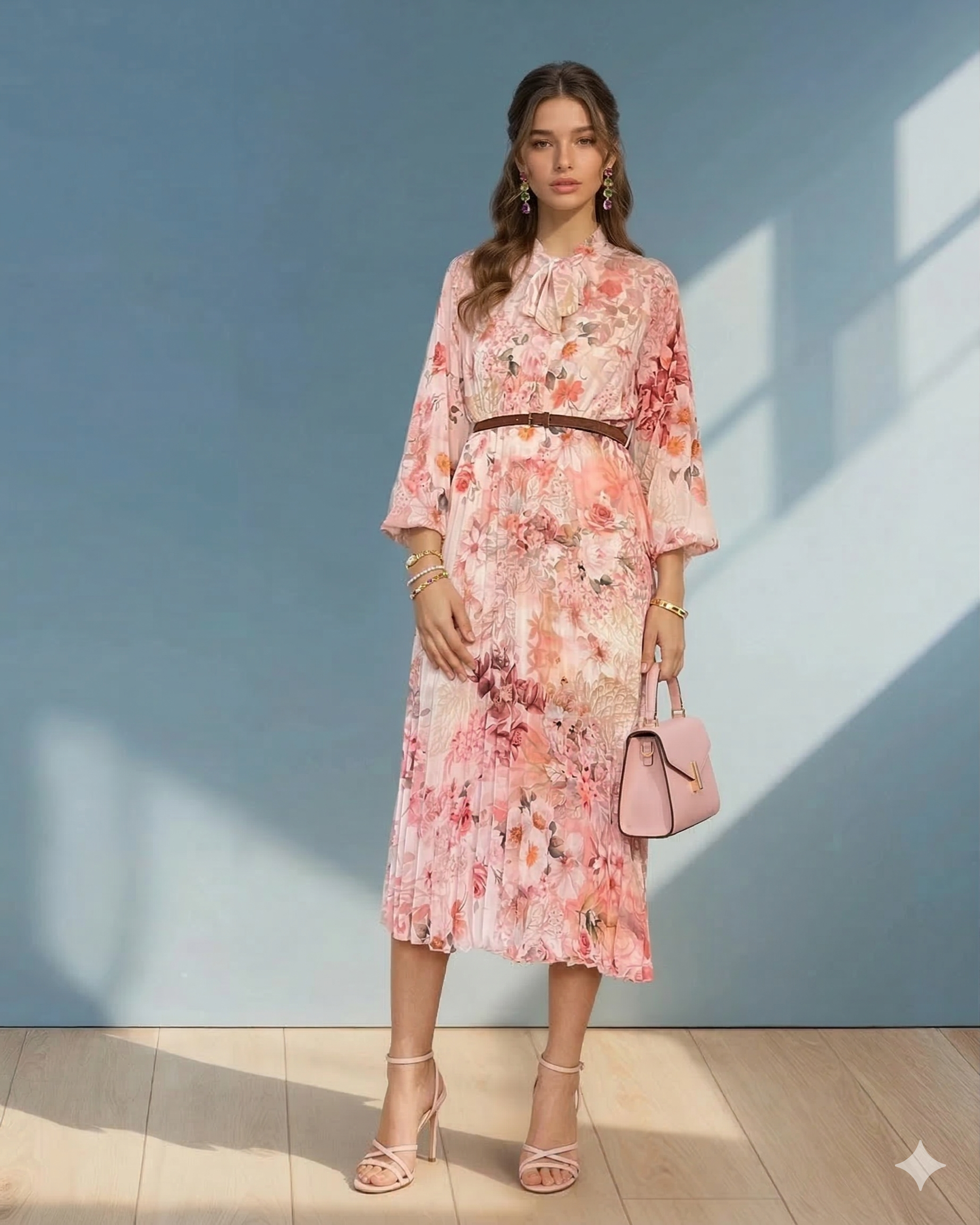 Rochie plisată cu legătură la guler și curea roz este alegerea ideală pentru o ținută feminină și elegantă în sezonul cald. Designul plisat oferă rochiei o mișcare fluidă și rafinată, perfectă pentru serile plăcute de vară sau pentru plimbările relaxate de primăvară.