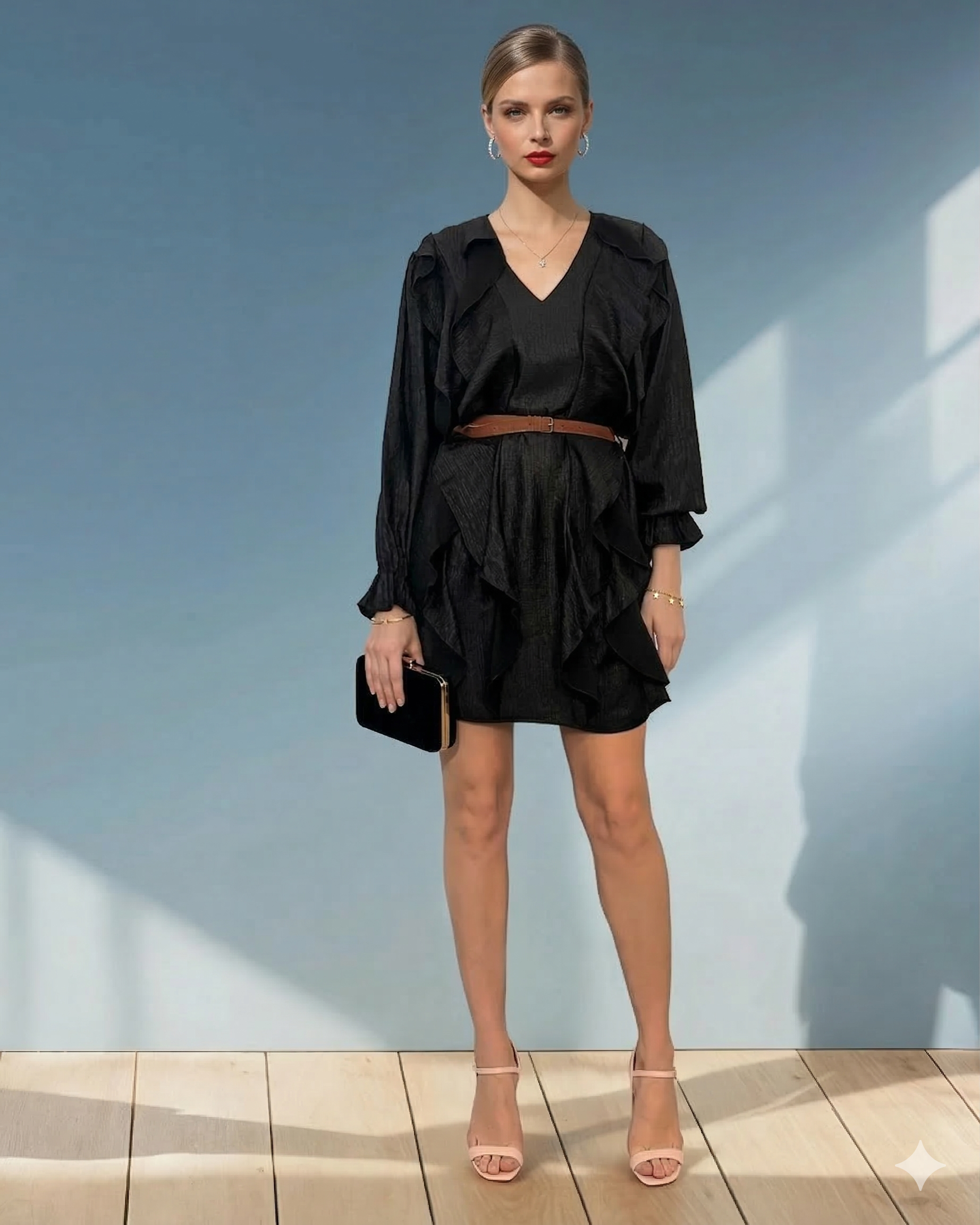 Rochie scurtă cu volane verticale neagră impresionează prin designul modern și detaliile feminine care adaugă dinamism ținutei. Volanele dispuse vertical oferă un efect vizual elegant și pun în valoare linia siluetei, creând un look sofisticat și actual.