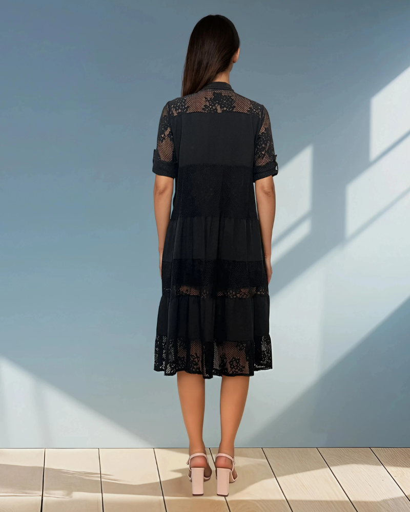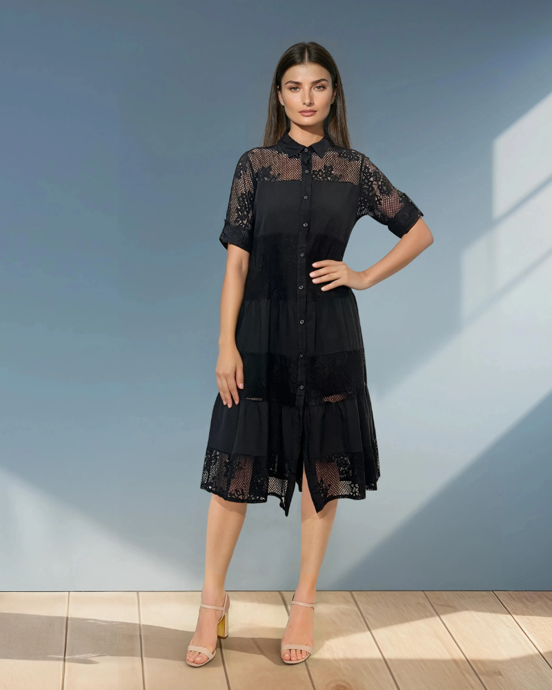 Rochie stil cămașă cu inserție din plasă negru combină eleganța clasică cu un detaliu modern, oferind un look sofisticat și feminin. Inserția din plasă adaugă un efect subtil și rafinat, evidențiind designul unic al rochiei.