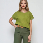Tricou din in cu buzunar pe partea stângă vernil oferă o notă delicată și fresh ținutelor tale casual. Materialul natural, respirabil și confortabil, este completat de buzunarul practic, care adaugă stil și funcționalitate.