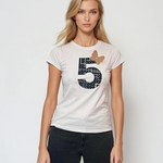 Tricou mulat din bumbac cu print numărul 5 alb, un model simplu și modern ce pune în evidență stilul casual și confortabil. Croiala mulată urmează formele corpului, iar materialul natural asigură o senzație plăcută pe piele pe tot parcursul zilei.