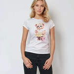 Tricou alb mulat din bumbac cu print ursuleț roz, ideal pentru un look jucăuș și confortabil. Materialul elastic și moale se mulează frumos pe corp, iar imprimeul cu ursuleț roz adaugă o notă drăguță ținutei tale casual de zi cu zi.