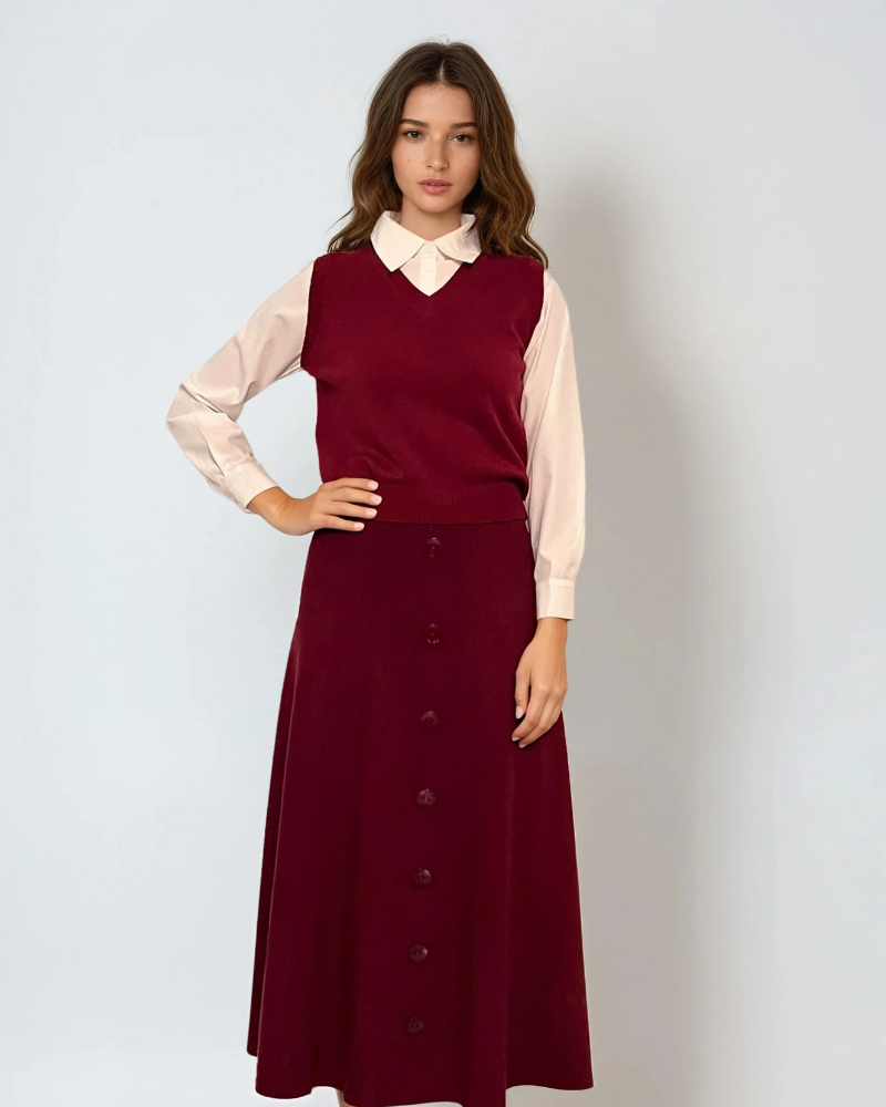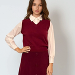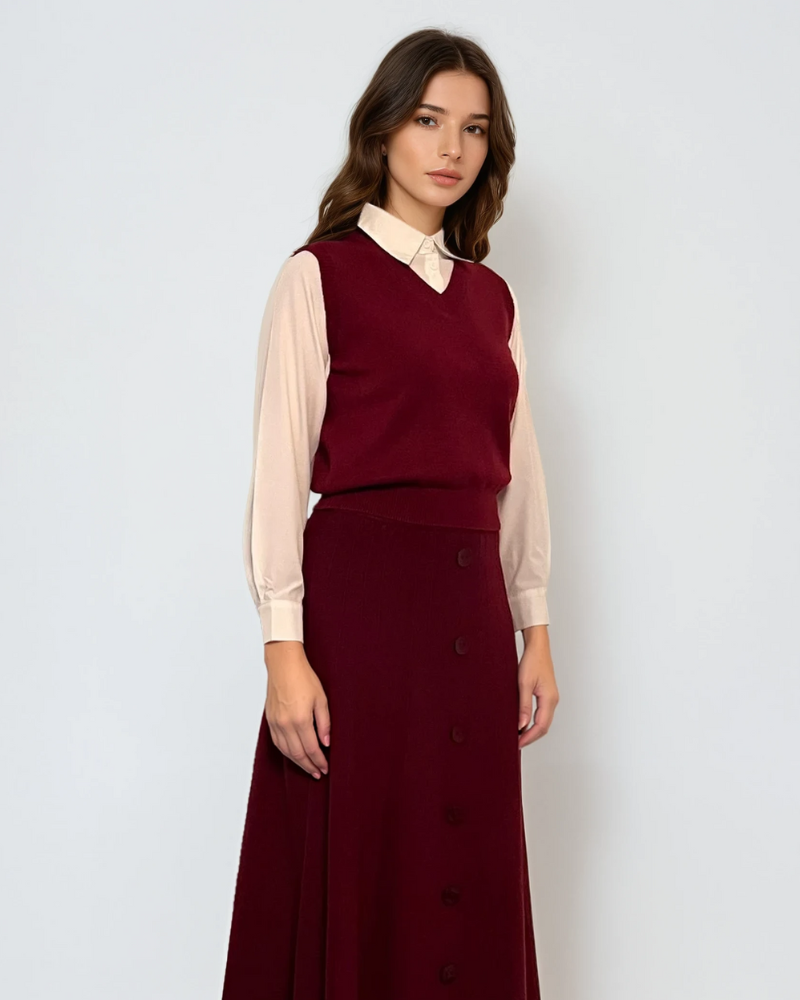 Vestă cu mâneci și guler cămașă grena adaugă un plus de rafinament și culoare ținutelor de zi. Este o alegere excelentă pentru birou sau ieșiri semi-formale, având un design care îmbină funcționalitatea cu stilul.